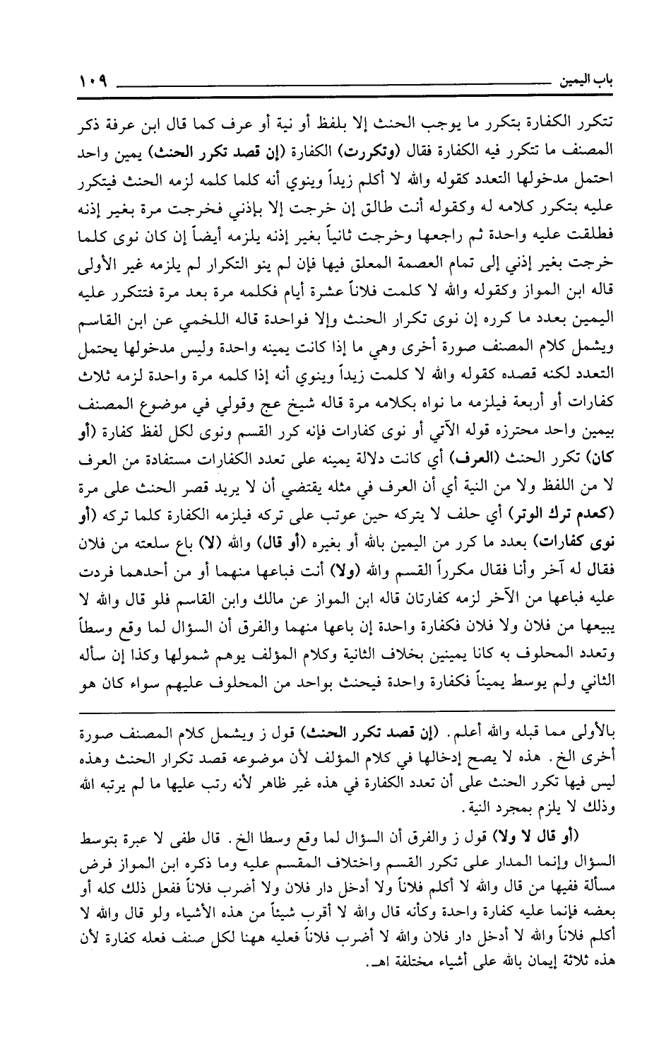 تتكرر الكفارة بتكرر ما يوجب الحنث إلا بلفظ أو نية أو عرف كما قال ابن عرفة ذكر المصنف ما تتكرر فيه الكفارة فقال (وتكررت) الكفارة (إن قصد تكرر الحنث) يمين واحد احتمل مدخولها التعدد كقوله والله لا أكلم زيدًا وينوي أنه كلما كلمه لزمه الحنث فيتكرر عليه بتكرر كلامه له وكقوله أنت طالق إن خرجت إلا بإذني فخرجت مرة بغير إذنه فطلقت عليه واحدة ثم راجعها وخرجت ثانيًا بغير إذنه يلزمه أيضًا إن كان نوى كلما خرجت بغير إذني إلى تمام العصمة المعلق فيها فإن لم ينو التكرار لم يلزمه غير الأولى قاله ابن المواز وكقوله والله لا كلمت فلانًا عشرة أيام فكلمه مرة بعد مرة فتتكرر عليه اليمين بعدد ما كرره إن نوى تكرار الحنث وإلا فواحدة قاله اللخمي عن ابن القاسم ويشمل كلام المصنف صورة أخرى وهي ما إذا كانت يمينه واحدة وليس مدخولها يحتمل التعدد لكنه قصده كقوله والله لا كلمت زيدًا وينوي أنه إذا كلمه مرة واحدة لزمه ثلاث كفارات أو أربعة فيلزمه ما نواه بكلامه مرة قاله شيخ عج وقولي في موضوع المصنف بيمين واحد محترزه قوله الآتي أو نوى كفارات فإنه كرر القسم ونوى لكل لفظ كفارة (أو كان) تكرر الحنث (العرف) أي كانت دلالة يمينه على تعدد الكفارات مستفادة من العرف لا من اللفظ ولا من النية أي أن العرف في مثله يقتضي أن لا يريد قصر الحنث على مرة (كعدم ترك الوتر) أي حلف لا يتركه حين عوتب على تركه فيلزمه الكفارة كلما تركه (أو نوى كفارات) بعدد ما كرر من اليمين بالله أو بغيره (أو قال) والله (لا) باع سلعته من فلان فقال له آخر وأنا فقال مكررًا القسم والله (ولا) أنت فباعها منهما أو من أحدهما فردت عليه فباعها من الآخر لزمه كفارتان قاله ابن المواز عن مالك وابن القاسم فلو قال والله لا يبيعها من فلان ولا فلان فكفارة واحدة إن باعها منهما والفرق أن السؤال لما وقع وسطًا وتعدد المحلوف به كانا يمينين بخلاف الثانية وكلام المؤلف يوهم شمولها وكذا إن سأله الثاني ولم يوسط يمينًا فكفارة واحدة فيحنث بواحد من المحلوف عليهم سواء كان هو