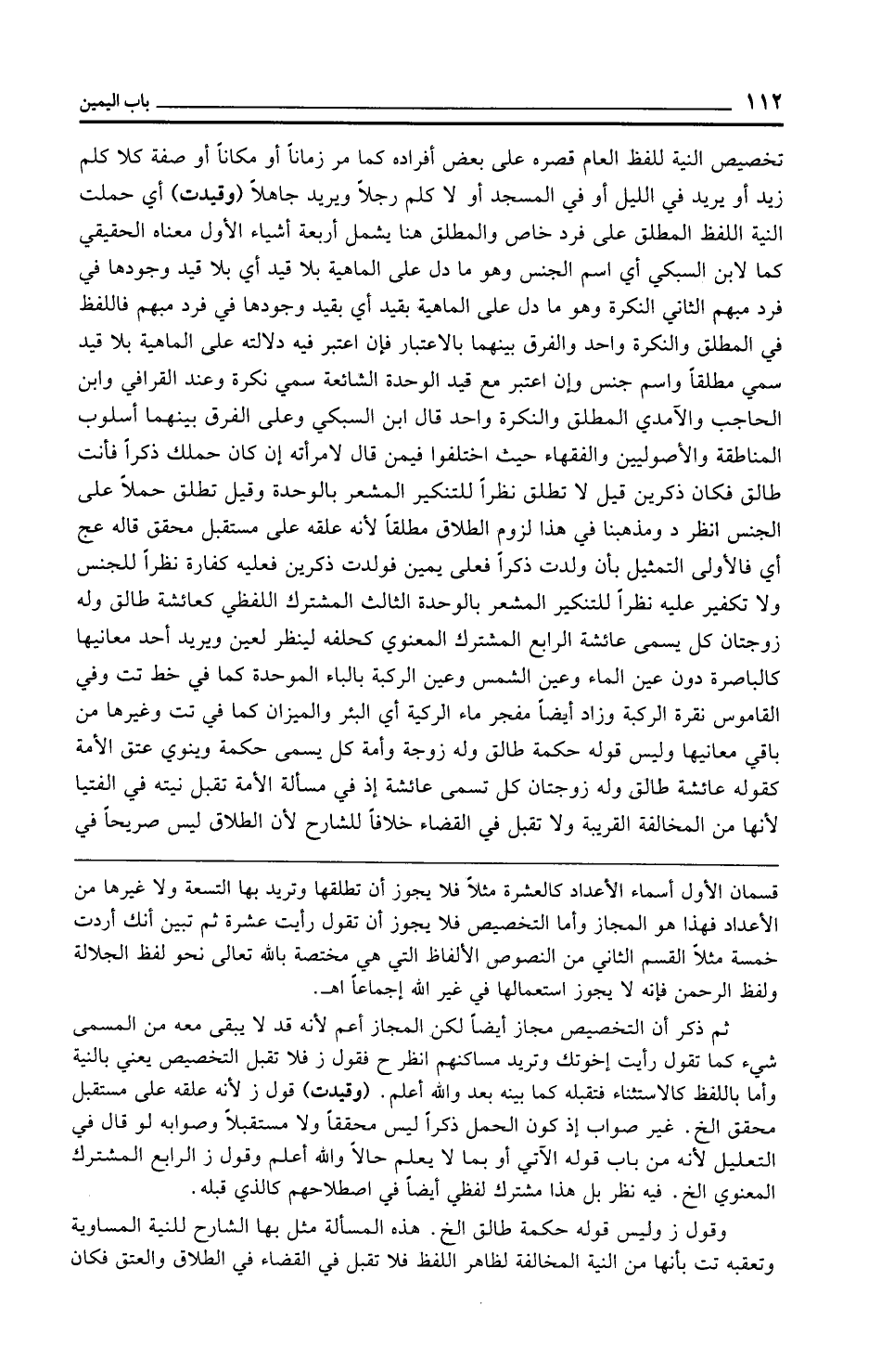 تخصيص النية للفظ العام قصره على بعض أفراده كما مر زمانًا أو مكانًا أو صفة كلا كلم زيد أو يريد في الليل أو في المسجد أو لا كلم رجلًا ويريد جاهلًا (وقيدت) أي حملت النية اللفظ المطلق على فرد خاص والمطلق هنا يشمل أربعة أشياء الأول معناه الحقيقي كما لابن السبكي أي اسم الجنس وهو ما دل على الماهية بلا قيد أي بلا قيد وجودها في فرد مبهم الثاني النكرة وهو ما دل على الماهية بقيد أي بقيد وجودها في فرد مبهم فاللفظ في المطلق والنكرة واحد والفرق بينهما بالاعتبار فإن اعتبر فيه دلالته على الماهية بلا قيد سمي مطلقًا واسم جنس وإن اعتبر مع قيد الوحدة الشائعة سمي نكرة وعند القرافي وابن الحاجب والآمدي المطلق والنكرة واحد قال ابن السبكي وعلى الفرق بينهما أسلوب المناطقة والأصوليين والفقهاء حيث اختلفوا فيمن قال لامرأته إن كان حملك ذكرًا فأنت طالق فكان ذكرين قيل لا تطلق نظرًا للتنكير المشعر بالوحدة وقيل تطلق حملًا على الجنس انظر د ومذهبنا في هذا لزوم الطلاق مطلقًا لأنه علقه على مستقبل محقق قاله عج أي فالأولى التمثيل بأن ولدت ذكرًا فعلى يمين فولدت ذكرين فعليه كفارة نظرًا للجنس ولا تكفير عليه نظرًا للتنكير المشعر بالوحدة الثالث المشترك اللفظي كعائشة طالق وله زوجتان كل يسمى عائشة الرابع المشترك المعنوي كحلفه لينظر لعين ويريد أحد معانيها كالباصرة دون عين الماء وعين الشمس وعين الركبة بالباء الموحدة كما في خط تت وفي القاموس نقرة الركبة وزاد أيضًا مفجر ماء الركية أي البئر والميزان كما في تت وغيرها من باقي معانيها وليس قوله حكمة طالق وله زوجة وأمة كل يسمى حكمة وينوي عتق الأمة كقوله عائشة طالق وله زوجتان كل تسمى عائشة إذ في مسألة الأمة تقبل نيته في الفتيا لأنها من المخالفة القريبة ولا تقبل في القضاء خلافًا للشارح لأن الطلاق ليس صريحًا في