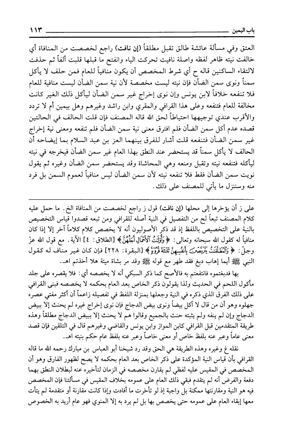 العتق وفي مسألة عائشة طالق تقبل مطلقًا (إن نافت) راجع لخصصت من المنافاة أي خالفت نيته ظاهر لفظه واصلة نافيت تحركت الياء وانفتح ما قبلها قلبت ألفًا ثم حذفت لالتقاء الساكنين قاله ح أي شرط المخصص أن يكون منافيًا للعام فمن حلف لا يأكل سمنًا ونوى سمن الضأن فإن نيته ليست مخصصة لأن نية سمن الضأن ليست منافية للعام فلا تنفعه خلافًا لابن يونس وإن نوى إخراج غير سمن الضأن ليأكل ذلك الغير كانت مخالفة للعام فتنفعه وعلى هذا القرافي والمقري وابن راشد وغيرهم وهل بيمين أم لا تردد والأقرب عندي توجيهها احتياطًا لحق الله قاله المصنف فإن قلت الحالف في الحالتين قصده عدم أكل سمن الضأن فلم افترق معنى نية سمن الضأن فلم تنفعه ومعنى نية إخراج غير سمن الضأن فتنفعه قلت أشار للفرق بينهما العز بن عبد السلام بما إيضاحه أن الحالف لا يأكل سمنًا قد يستحضر عند النطق بهذا العام غير سمن الضأن فيخرجه في نيته ليأكله فتنفعه نيته وتقبل ومنعه وهي المحاشاة وقد يستحضر سمن الضأن وغيره ثم يقول نويت سمن الضأن فقط فلا تنفعه نيته لأن سمن الضأن ليس منافيًا لعموم السمن بل فرد منه وسننزل ما يأتي للمصنف على ذلك.
