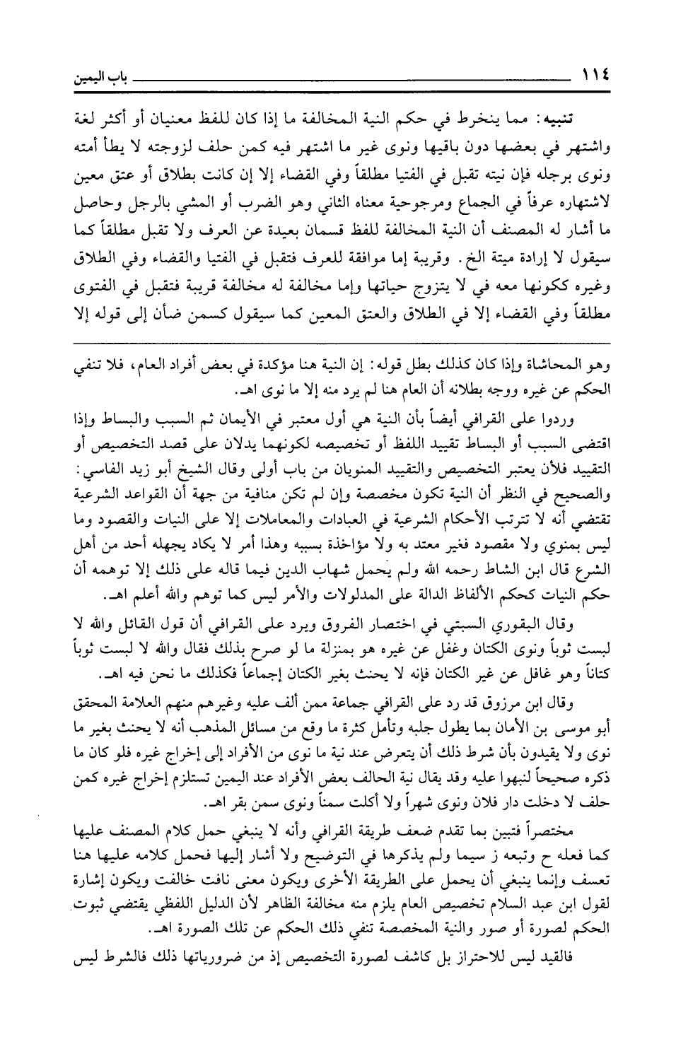 وردوا على القرافي أيضًا بأن النية هي أول معتبر في الأيمان ثم السبب والبساط وإذا اقتضى السبب أو البساط تقييد اللفظ أو تخصيصه لكونهما يدلان على قصد التخصيص أو التقييد فلأن يعتبر التخصيص والتقييد المنويان من باب أولى وقال الشيخ أبو زيد الفاسي: والصحيح في النظر أن النية تكون مخصصة وإن لم تكن منافية من جهة أن القواعد الشرعية تقتضي أنه لا تترتب الأحكام الشرعية في العبادات والمعاملات إلا على النيات والقصود وما ليس بمنوي ولا مقصود فغير معتد به ولا مؤاخذة بسببه وهذا أمر لا يكاد يجهله أحد من أهل الشرع قال ابن الشاط رحمه الله ولم يحمل شهاب الدين فيما قاله على ذلك إلا توهمه أن حكم النيات كحكم الألفاظ الدالة على المدلولات والأمر ليس كما توهم والله أعلم اهـ.