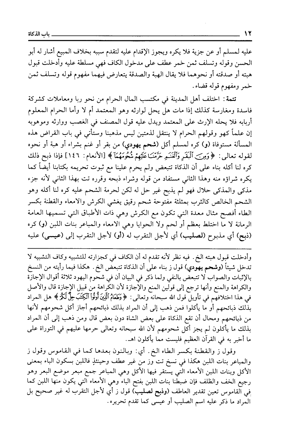 وأدخلت قبول هبته الخ. فيه نظر لأنه تقدم له أن الكاف في كجزارته للتشبيه وكاف التشبيه لا تدخل شيئًا (وشحم يهودي) قول ز بناء على أن الذكاة تتبعض الخ. هكذا فيما رأيته من النسخ بالإثبات والصواب لا تتبعض بالنفي ولما ذكر في البيان أن في شحوم اليهود ثلاثة أقوال الإجازة والكراهة والمنع وأنها ترجع إلى قولين المنع والإجازة لأن الكراهة من قبيل الإجازة قال والأصل في هذا اختلافهم في تأويل قول الله سبحانه وتعالى: {وَطَعَامُ الَّذِينَ أُوتُوا الْكِتَابَ حِلٌّ لَكُمْ} هل المراد بذلك ذبائحهم أو ما يأكلوا فمن ذهب إلى أن المراد بذلك ذبائحهم أجاز أكل شحومهم لأنها من ذبائحهم ومحال أن تقع الذكاة على بعض الشاة دون بعض قال ومن ذهب إلى أن المراد بذلك ما يأكلون لم يجز أكل شحومهم لأن الله سبحانه وتعالى حرمها عليهم في التوراة على ما أخبر به في القرآن العظيم فليست مما يأكلون اهـ.