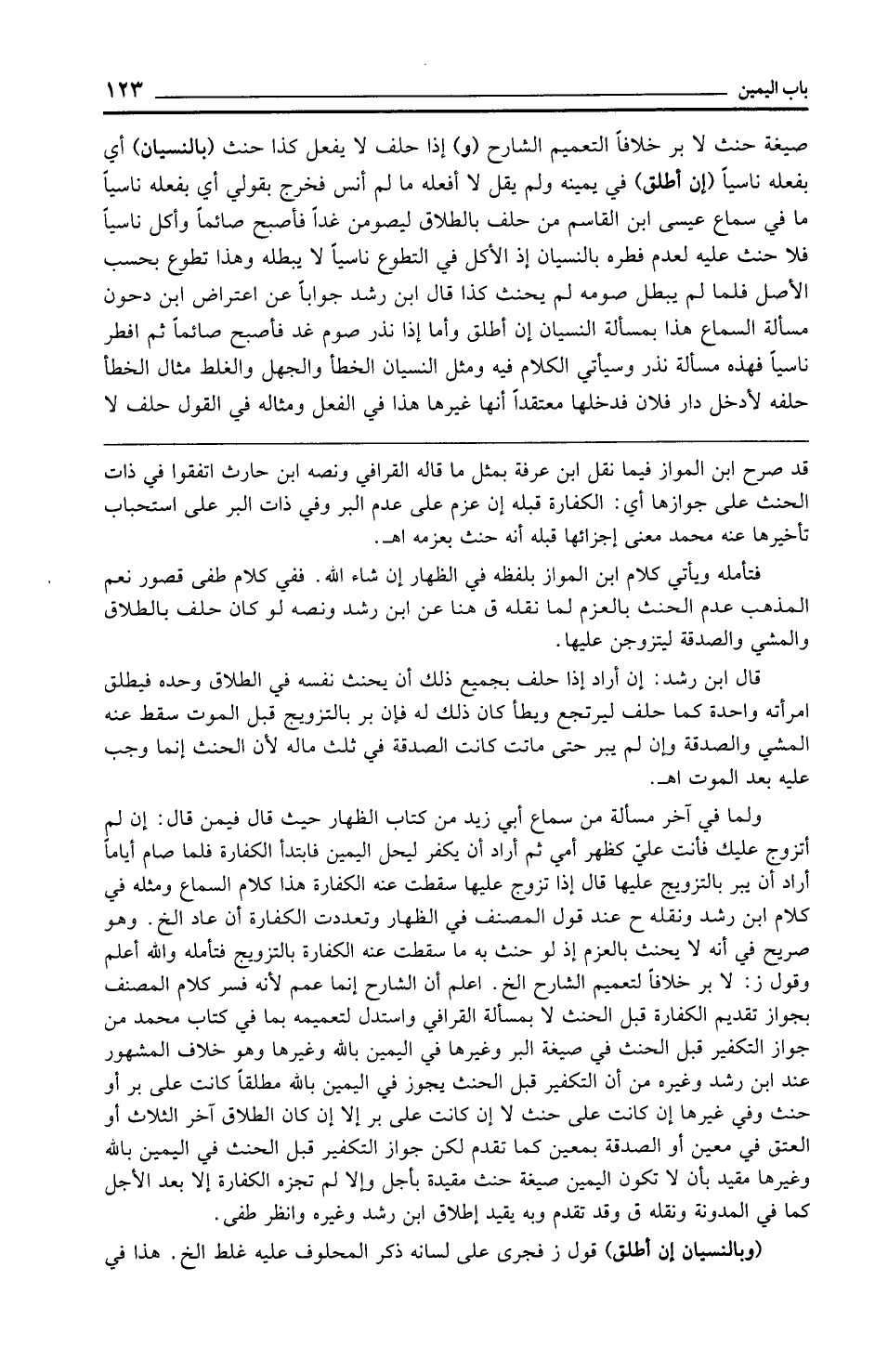 فتأمله ويأتي كلام ابن المواز بلفظه في الظهار إن شاء الله. ففي كلام طفى قصور نعم المذهب عدم الحنث بالعزم لما نقله ق هنا عن ابن رشد ونصه لو كان حلف بالطلاق والمشي والصدقة ليتزوجن عليها.