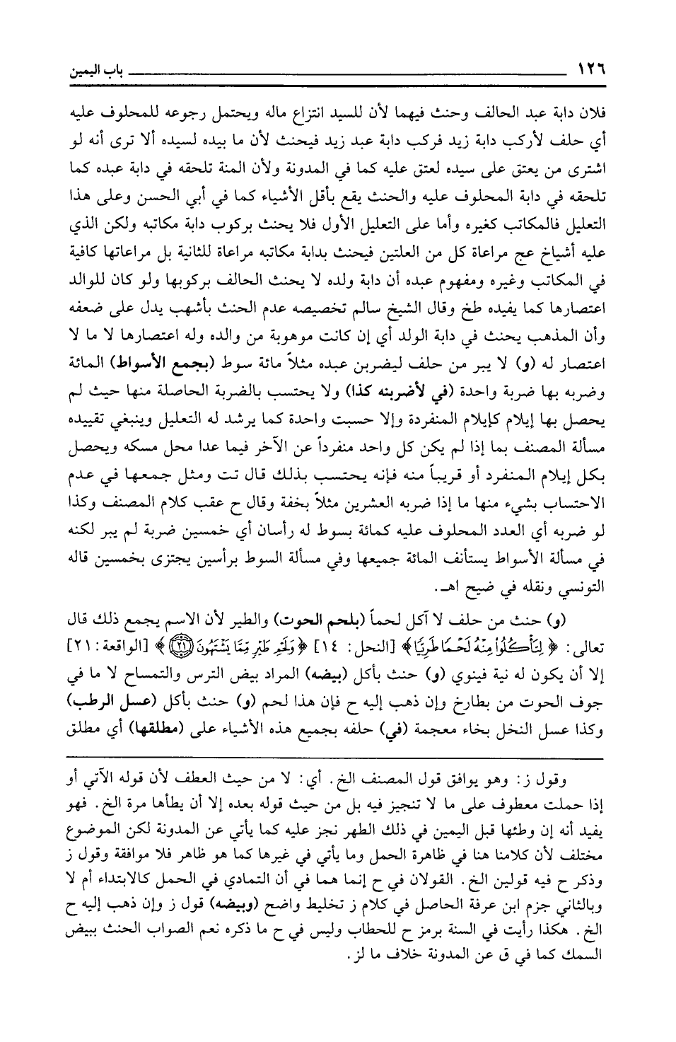 (و) حنث من حلف لا آكل لحمًا (بلحم الحوت) والطير لأن الاسم يجمع ذلك قال تعالى: {لِتَأْكُلُوا مِنْهُ لَحْمًا طَرِيًّا} [النحل: 14] {وَلَحْمِ طَيْرٍ مِمَّا يَشْتَهُونَ (21)} [الواقعة: 21] إلا أن يكون له نية فينوي (و) حنث بأكل (بيضه) المراد بيض الترس والتمساح لا ما في جوف الحوت من بطارخ وإن ذهب إليه ح فإن هذا لحم (و) حنث بأكل (عسل الرطب) وكذا عسل النخل بخاء معجمة (في) حلفه بجميع هذه الأشياء على (مطلقها) أي مطلق