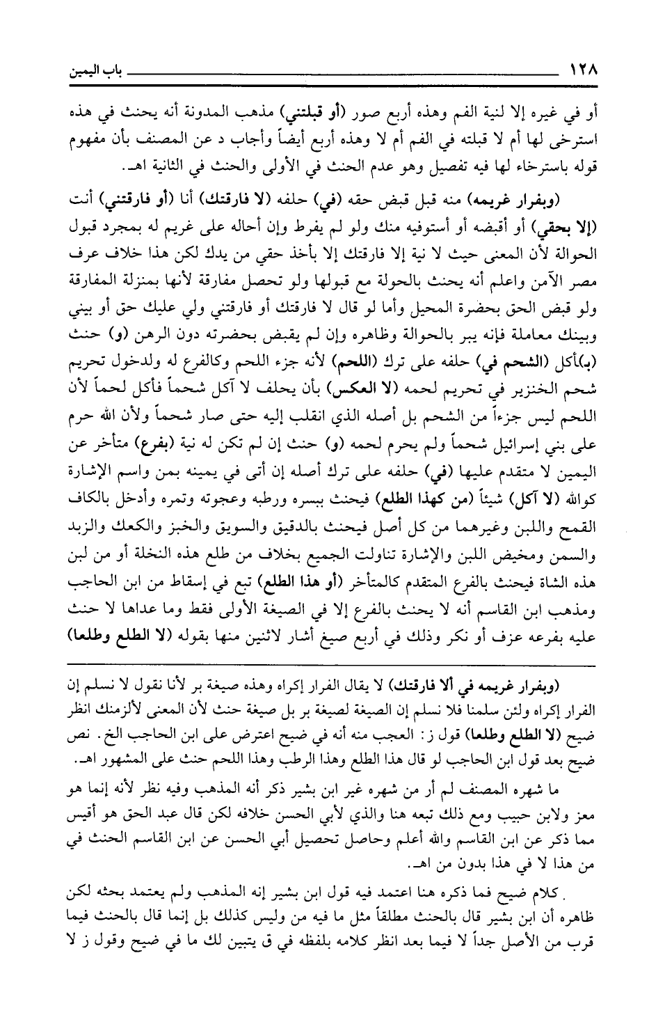 (وبفرار غريمه) منه قبل قبض حقه (في) حلفه (لا فارقتك) أنا (أو فارقتني) أنت (إلا بحقي) أو أقبضه أو أستوفيه منك ولو لم يفرط وإن أحاله على غريم له بمجرد قبول الحوالة لأن المعنى حيث لا نية إلا فارقتك إلا بأخذ حقي من يدك لكن هذا خلاف عرف مصر الآمن واعلم أنه يحنث بالحولة مع قبولها ولو تحصل مفارقة لأنها بمنزلة المفارقة ولو قبض الحق بحضرة المحيل وأما لو قال لا فارقتك أو فارقتني ولي عليك حق أو بيني وبينك معاملة فإنه يبر بالحوالة وظاهره وإن لم يقبض بحضرته دون الرهن (و) حنث (بـ) أكل (الشحم في) حلفه على ترك (اللحم) لأنه جزء اللحم وكالفرع له ولدخول تحريم شحم الخنزير في تحريم لحمه (لا العكس) بأن يحلف لا آكل شحمًا فأكل لحمًا لأن اللحم ليس جزءًا من الشحم بل أصله الذي انقلب إليه حتى صار شحمًا ولأن الله حرم علي بني إسرائيل شحمًا ولم يحرم لحمه (و) حنث إن لم تكن له نية (بفرع) متأخر عن اليمين لا متقدم عليها (في) حلفه على ترك أصله إن أتى في يمينه بمن واسم الإشارة كوالله (لا آكل) شيئًا (من كهذا الطلع) فيحنث ببسره ورطبه وعجوته وتمره وأدخل بالكاف القمح واللبن وغيرهما من كل أصل فيحنث بالدقيق والسويق والخبر والكعك والزبد والسمن ومخيض اللبن والإشارة تناولت الجميع بخلاف من طلع هذه النخلة أو من لبن هذه الشاة فيحنث بالفرع المتقدم كالمتأخر (أو هذا الطلع) تبع في إسقاط من ابن الحاجب ومذهب ابن القاسم أنه لا يحنث بالفرع إلا في الصيغة الأولى فقط وما عداها لا حنث عليه بفرعه عزف أو نكر وذلك في أربع صيغ أشار لاثنين منها بقوله (لا الطلع وطلعا)