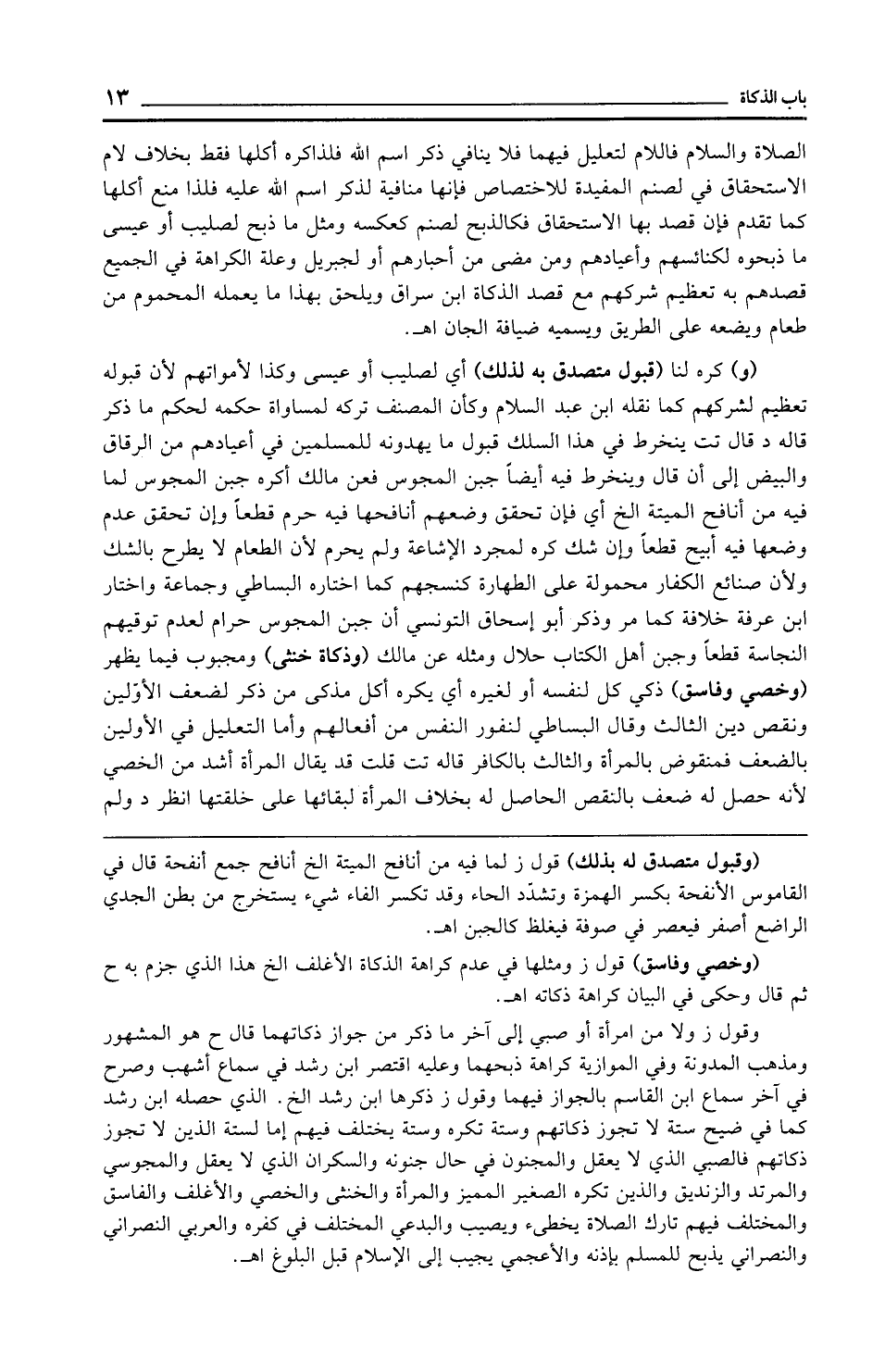 (و) كره لنا (قبول متصدق به لذلك) أي لصليب أو عيسى وكذا لأمواتهم لأن قبوله تعظيم لشركهم كما نقله ابن عبد السلام وكأن المصنف تركه لمساواة حكمه لحكم ما ذكر قاله د قال تت ينخرط في هذا السلك قبول ما يهدونه للمسلمين في أعيادهم من الرقاق والبيض إلى أن قال وينخرط فيه أيضًا جبن المجوس فعن مالك أكره جبن المجوس لما فيه من أنافح الميتة الخ أي فإن تحقق وضعهم أنافحها فيه حرم قطعًا وإن تحقق عدم وضعها فيه أبيح قطعًا وإن شك كره لمجرد الإشاعة ولم يحرم لأن الطعام لا يطرح بالشك ولأن صنائع الكفار محمولة على الطهارة كنسجهم كما اختاره البساطي وجماعة واختار ابن عرفة خلافة كما مر وذكر أبو إسحاق التونسي أن جبن المجوس حرام لعدم توقيهم النجاسة قطعًا وجبن أهل الكتاب حلال ومثله عن مالك (وذكاة خنثى) ومجبوب فيما يظهر (وخصي وفاسق) ذكي كل لنفسه أو لغيره أي يكره أكل مذكى من ذكر لضعف الأوّلين ونقص دين الثالث وقال البساطي لنفور النفس من أفعالهم وأما التعليل في الأولين بالضعف فمنقوض بالمرأة والثالث بالكافر قاله تت قلت قد يقال المرأة أشد من الخصي لأنه حصل له ضعف بالنقص الحاصل له بخلاف المرأة لبقائها على خلقتها انظر د ولم