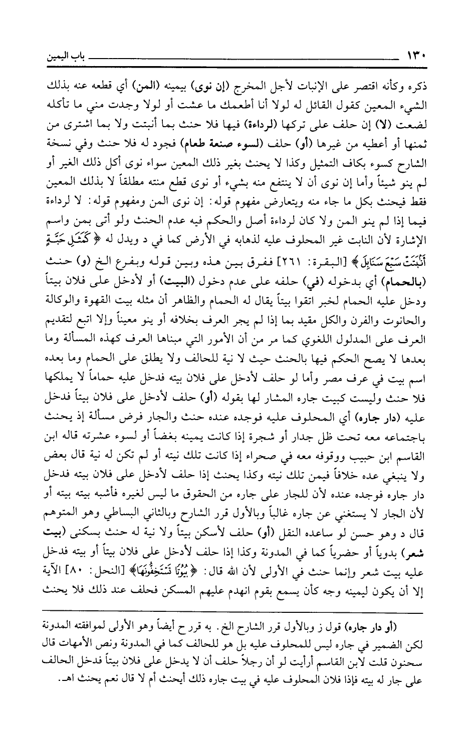 ذكره وكأنه اقتصر على الإنبات لأجل المخرج (إن نوى) بيمينه (المن) أي قطعه عنه بذلك الشيء المعين كقول القائل له لولا أنا أطعمك ما عشت أو لولا وجدت مني ما تأكله لضعت (لا) إن حلف على تركها (لرداءة) فيها فلا حنث بما أنبتت ولا بما اشترى من ثمنها أو أعطيه من غيرها (أو) حلف (لسوء صنعة طعام) فجود له فلا حنث وفي نسخة الشارح كسوء بكاف التمثيل وكذا لا يحنث بغير ذلك المعين سواء نوى أكل ذلك الغير أو لم ينو شيئًا وأما إن نوى أن لا ينتفع منه بشيء أو نوى قطع منته مطلقًا لا بذلك المعين فقط فيحنث بكل ما جاء منه ويتعارض مفهوم قوله: إن نوى المن ومفهوم قوله: لا لرداءة فيما إذا لم ينو المن ولا كان لرداءة أصل والحكم فيه عدم الحنث ولو أتى بمن واسم الإشارة لأن النابت غير المحلوف عليه لذهابه في الأرض كما في د ويدل له {كَمَثَلِ حَبَّةٍ أَنْبَتَتْ سَبْعَ سَنَابِلَ} [البقرة: 261] ففرق بين هذه وبين قوله وبفرع الخ (و) حنث (بالحمام) أي بدخوله (في) حلفه على عدم دخول (البيت) أو لأدخل على فلان بيتًا ودخل عليه الحمام لخبر اتقوا بيتًا يقال له الحمام والظاهر أن مثله بيت القهوة والوكالة والحانوت والفرن والكل مقيد بما إذا لم يجر العرف بخلافه أو ينو معينًا وإلا اتبع لتقديم العرف على المدلول اللغوي كما مر من أن الأمور التي مبناها العرف كهذه المسألة وما بعدها لا يصح الحكم فيها بالحنث حيث لا نية للحالف ولا يطلق على الحمام وما بعده اسم بيت في عرف مصر وأما لو حلف لأدخل على فلان بيته فدخل عليه حمامًا لا يملكها فلا حنث وليست كبيت جاره المشار لها بقوله (أو) حلف لأدخل على فلان بيتًا فدخل عليه (دار جاره) أي المحلوف عليه فوجده عنده حنث والجار فرض مسألة إذ يحنث باجتماعه معه تحت ظل جدار أو شجرة إذا كانت يمينه بغضًا أو لسوء عشرته قاله ابن القاسم ابن حبيب ووقوفه معه في صحراء إذا كانت تلك نيته أو لم تكن له نية قال بعض ولا ينبغي عده خلافًا فيمن تلك نيته وكذا يحنث إذا حلف لأدخل على فلان بيته فدخل دار جاره فوجده عنده لأن للجار على جاره من الحقوق ما ليس لغيره فأشبه بيته بيته أو لأن الجار لا يستغني عن جاره غالبًا وبالأول قرر الشارح وبالثاني البساطي وهو المتوهم قال د وهو حسن لو ساعده النقل (أو) حلف لأسكن بيتًا ولا نية له حنث بسكنى (بيت شعر) بدويًّا أو حضريًّا كما في المدونة وكذا إذا حلف لأدخل على فلان بيتًا أو بيته فدخل عليه بيت شعر وإنما حنث في الأولى لأن الله قال: {بُيُوتًا تَسْتَخِفُّونَهَا} [النحل: 80] إلا أن يكون ليمينه وجه كأن يسمع بقوم انهدم عليهم المسكن فحلف عند ذلك فلا يحنث