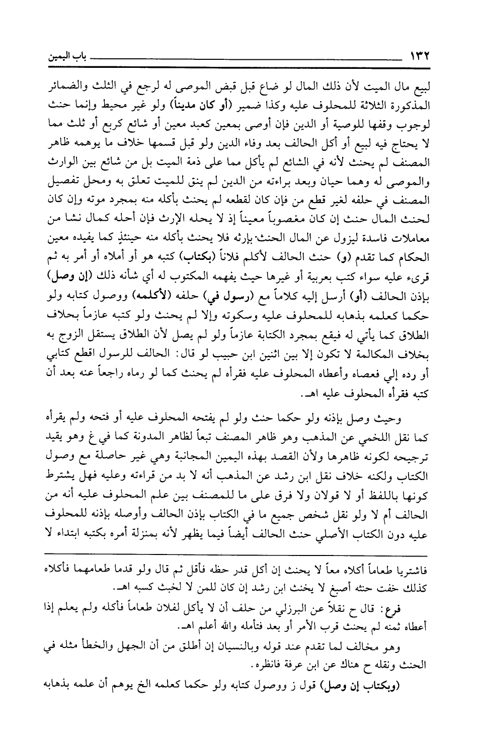 لبيع مال الميت لأن ذلك المال لو ضاع قبل قبض الموصى له لرجع في الثلث والضمائر المذكورة الثلاثة للمحلوف عليه وكذا ضمير (أو كان مدينًا) ولو غير محيط وإنما حنث لوجوب وقفها للوصية أو الدين فإن أوصى بمعين كعبد معين أو شائع كربع أو ثلث مما لا يحتاج فيه لبيع أو أكل الحالف بعد وفاء الدين ولو قبل قسمها خلاف ما يوهمه ظاهر المصنف لم يحنث لأنه في الشائع لم يأكل مما على ذمة الميت بل من شائع بين الوارث والموصى له وهما حيان وبعد براءته من الدين لم ينق للميت تعلق به ومحل تفصيل المصنف في حلفه لغير قطع من فإن كان لقطعه لم يحنث بأكله منه بمجرد موته وإن كان لحنث المال حنث إن كان مغصوبًا معينًا إذ لا يحله الإرث فإن أحله كمال نشا من معاملات فاسدة ليزول عن المال الحنث بإرثه فلا يحنث بأكله منه حينئذٍ كما يفيده معين الحكام كما تقدم (و) حنث الحالف لأكلم فلانًا (بكتاب) كتبه هو أو أملاه أو أمر به ثم قرئ عليه سواء كتب بعربية أو غيرها حيث يفهمه المكتوب له أي شأنه ذلك (إنه وصل) بإذن الحالف (أو) أرسل إليه كلامًا مع (رسول في) حلفه (لأكلمه) ووصول كتابه ولو حكمًا كعلمه بذهابه للمحلوف عليه وسكوته وإلا لم يحنث ولو كتبه عازمًا بحلاف الطلاق كما يأتي له فيقع بمجرد الكتابة عازمًا ولو لم يصل لأن الطلاق يستقل الزوج به بخلاف المكالمة لا تكون إلا بين اثنين ابن حبيب لو قال: الحالف للرسول اقطع كتابي أو رده إلى فعصاه وأعطاه المحلوف عليه فقرأه لم يحنث كما لو رماه راجعًا عنه بعد أن كتبه فقرأه المحلوف عليه اهـ.