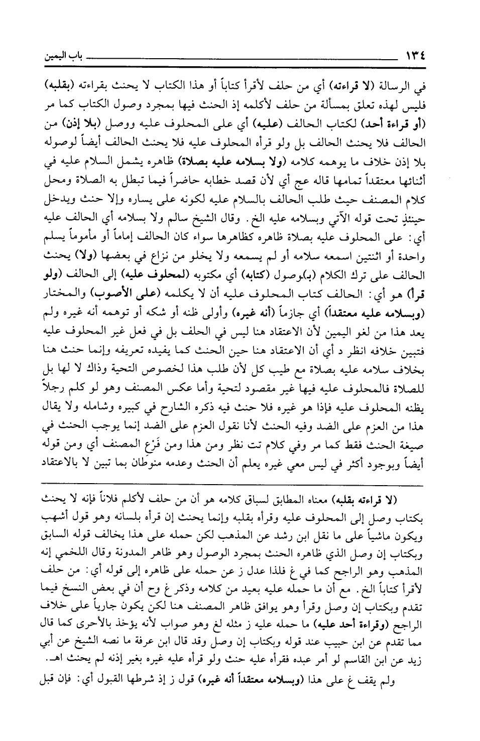 في الرسالة (لا قراءته) أي من حلف لأقرأ كتابًا أو هذا الكتاب لا يحنث بقراءته (بقلبه) فليس لهذه تعلق بمسألة من حلف لأكلمه إذ الحنث فيها بمجرد وصول الكتاب كما مر (أو قراءة أحد) لكتاب الحالف (عليه) أي على المحلوف عليه ووصل (بلا إذن) من الحالف فلا يحنث الحالف بل ولو قرأه المحلوف عليه فلا يحنث الحالف أيضًا لوصوله بلا إذن خلاف ما يوهمه كلامه (ولا بسلامه عليه بصلاة) ظاهره يشمل السلام عليه في أثنائها معتقدًا تمامها قاله عج أي لأن قصد خطابه حاضرًا فيما تبطل به الصلاة ومحل كلام المصنف حيث طلب الحالف بالسلام عليه لكونه على يساره وإلا حنث ويدخل حينئذٍ تحت قوله الآتي وبسلامه عليه الخ. وقال الشيخ سالم ولا بسلامه أي الحالف عليه أي: على المحلوف عليه بصلاة ظاهره كظاهرها سواء كان الحالف إمامًا أو مأمومًا يسلم واحدة أو اثنتين اسمعه سلامه أو لم يسمعه ولا يخلو من نزاع في بعضها (ولا) يحنث الحالف على ترك الكلام (بـ) ـوصول (كتابه) أي مكتوبه (لمحلوف عليه) إلى الحالف (ولو قرأ) هو أي: الحالف كتاب المحلوف عليه أن لا يكلمه (على الأصوب) والمختار (وبسلامه عليه معتقدًا) أي جازمًا (أنه غيره) وأولى ظنه أو شكه أو توهمه أنه غيره ولم يعد هذا من لغو اليمين لأن الاعتقاد هنا ليس في الحلف بل في فعل غير المحلوف عليه فتبين خلافه انظر د أي أن الاعتقاد هنا حين الحنث كما يفيده تعريفه وإنما حنث هنا بخلاف سلامه عليه بصلاة مع طيب كل لأن طلب هذا لخصوص التحية وذاك لا لها بل للصلاة فالمحلوف عليه فيها غير مقصود لتحية وأما عكس المصنف وهو لو كلم رجلًا يظنه المحلوف عليه فإذا هو غيره فلا حنث فيه ذكره الشارح في كبيره وشامله ولا يقال هذا من العزم على الضد وفيه الحنث لأنا نقول العزم على الضد إنما يوجب الحنث في صيغة الحنث فقط كما مر وفي كلام تت نظر ومن هذا ومن فَرْعِ المصنف أي ومن قوله أيضًا وبوجود أكثر في ليس معي غيره يعلم أن الحنث وعدمه منوطان بما تبين لا بالاعتقاد