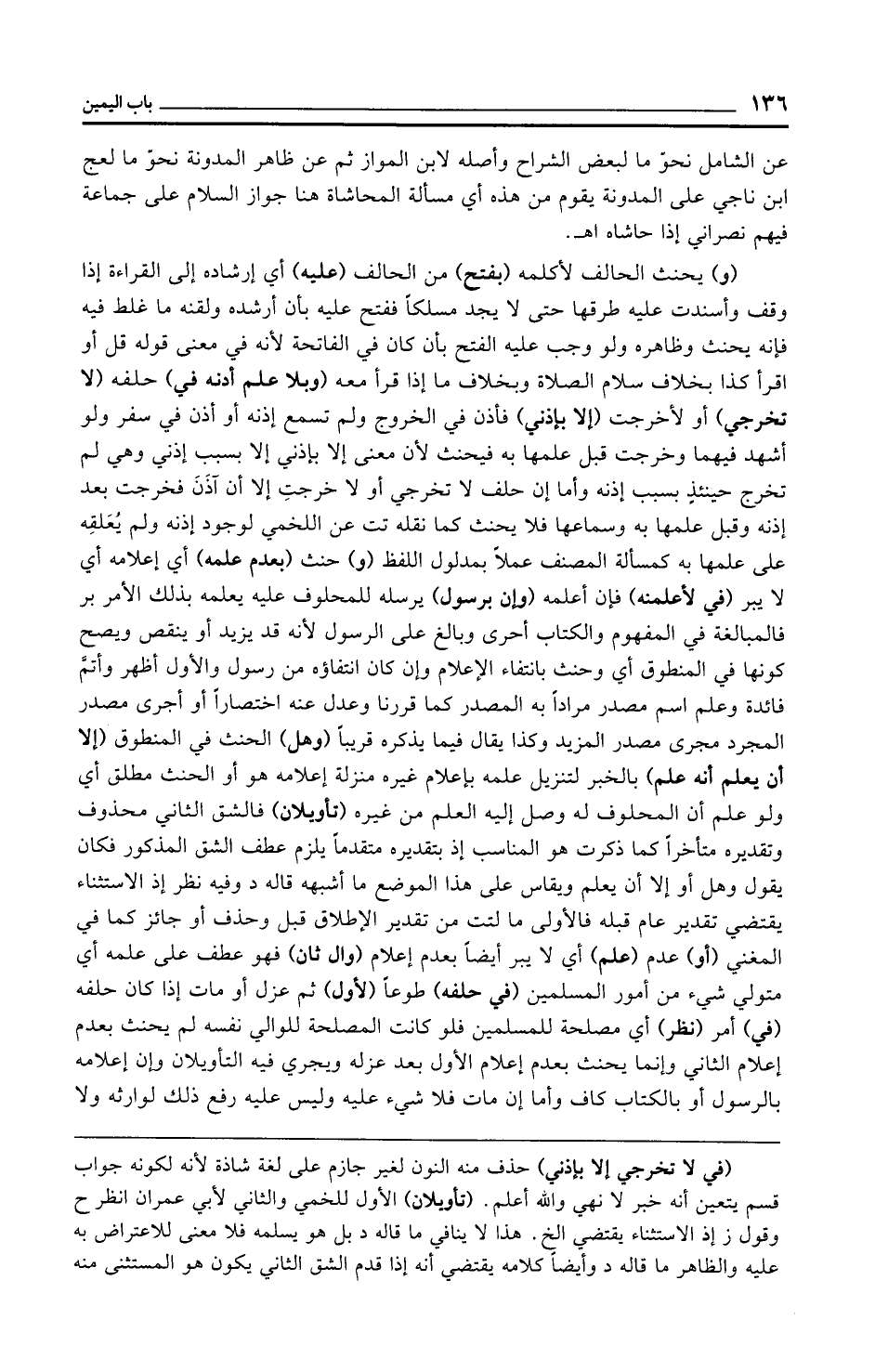 (و) يحنث الحالف لأكلمه (بفتح) من الحالف (عليه) أي إرشاده إلى القراءة إذا وقف وأسندت عليه طرقها حتى لا يجد مسلكًا ففتح عليه بأن أرشده ولقنه ما غلط فيه فإنه يحنث وظاهره ولو وجب عليه الفتح بأن كان في الفاتحة لأنه في معنى قوله قل أو اقرأ كذا بخلاف سلام الصلاة وبخلاف ما إذا قرأ معه (وبلا علم أدنه في) حلفه (لا تخرجي) أو لأخرجت (إلا بإذني) فأذن في الخروج ولم تسمع إذنه أو أذن في سفر ولو أشهد فيهما وخرجت قبل علمها به فيحنث لأن معنى إلا بإذني إلا بسبب إذني وهي لم تخرج حينئذٍ بسبب إذنه وأما إن حلف لا تخرجي أو لا خرجتِ إلا أن آذَنَ فخرجت بعد إذنه وقبل علمها به وسماعها فلا يحنث كما نقله تت عن اللخمي لوجود إذنه ولم يُعَلقِه على علمها به كمسألة المصنف عملًا بمدلول اللفظ (و) حنث (بعدم علمه) أي إعلامه أي لا يبر (في لأعلمنه) فإن أعلمه (وإن برسول) يرسله للمحلوف عليه يعلمه بذلك الأمر بر فالمبالغة في المفهوم والكتاب أحرى وبالغ على الرسول لأنه قد يزيد أو ينقص ويصح كونها في المنطوق أي وحنث بانتفاء الإعلام وإن كان انتفاؤه من رسول والأول أظهر وأتمَّ فائدة وعلم اسم مصدر مرادًا به المصدر كما قررنا وعدل عنه اختصارًا أو أجرى مصدر المجرد مجرى مصدر المزيد وكذا يقال فيما يذكره قريبًا (وهل) الحنث في المنطوق (إلا أن يعلم أنه علم) بالخبر لتنزيل علمه بإعلام غيره منزلة إعلامه هو أو الحنث مطلق أي ولو علم أن المحلوف له وصل إليه العلم من غيره (تأويلان) فالشق الثاني محذوف وتقديره متأخرًا كما ذكرت هو المناسب إذ بتقديره متقدمًا يلزم عطف الشق المذكور فكان يقول وهل أو إلا أن يعلم ويقاس على هذا الموضع ما أشبهه قاله د وفيه نظر إذ الاستثناء يقتضي تقدير عام قبله فالأولى ما لتت من تقدير الإطلاق قبل وحذف أو جائز كما في المغني (أو) عدم (علم) أي لا يبر أيضًا بعدم إعلام (وال ثان) فهو عطف على علمه أي متولي شيء من أمور المسلمين (في حلفه) طوعًا (لأول) ثم عزل أو مات إذا كان حلفه (في) أمر (نظر) أي مصلحة للمسلمين فلو كانت المصلحة للوالي نفسه لم يحنث بعدم إعلام الثاني وإنما يحنث بعدم إعلام الأول بعد عزله ويجري فيه التأويلان وإن إعلامه بالرسول أو بالكتاب كاف وأما إن مات فلا شيء عليه وليس عليه رفع ذلك لوارثه ولا