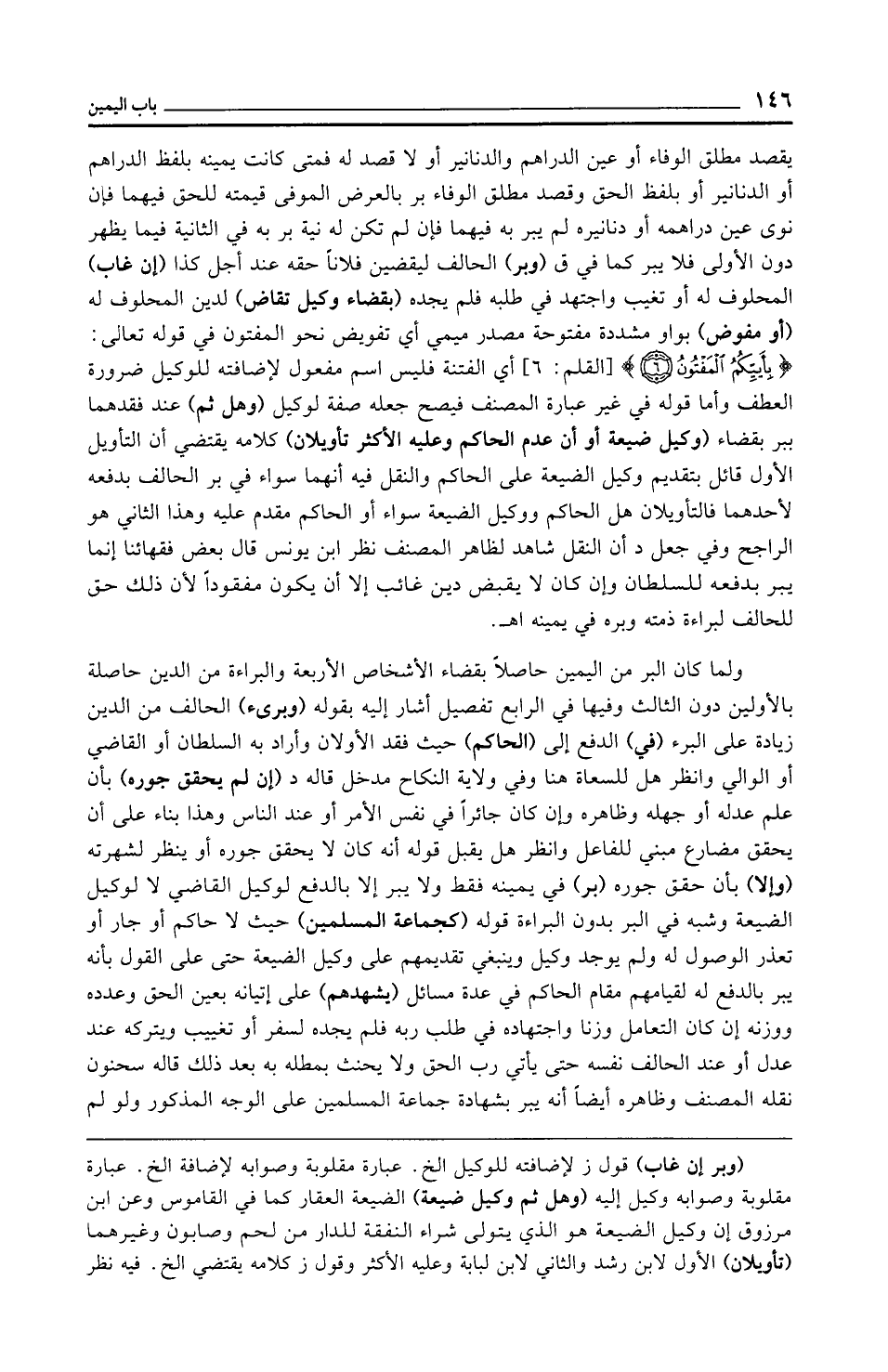 يقصد مطلق الوفاء أو عين الدراهم والدنانير أو لا قصد له فمتى كانت يمينه بلفظ الدراهم أو الدنانير أو بلفظ الحق وقصد مطلق الوفاء بر بالعرض الموفى قيمته للحق فيهما فإن نوى عين دراهمه أو دنانيره لم يبر به فيهما فإن لم تكن له نية بر به في الثانية فيما يظهر دون الأولى فلا يبر كما في ق (وبر) الحالف ليقضين فلانًا حقه عند أجل كذا (إن غاب) المحلوف له أو تغيب واجتهد في طلبه فلم يجده (بقضاء وكيل تقاص) لدين المحلوف له (أو مفوض) بواو مشددة مفتوحة مصدر ميمي أي تفويض نحو المفتون في قوله تعالى: {بِأَيِّكُمُ الْمَفْتُونُ (6)} [القلم: 6] أي الفتنة فليس اسم مفعول لإضافته للوكيل ضرورة العطف وأما قوله في غير عبارة المصنف فيصح جعله صفة لوكيل (وهل ثم) عند فقدهما ببر بقضاء (وكيل ضيعة أو أن عدم الحاكم وعليه الأكثر تأويلان) كلامه يقتضي أن التأويل الأول قائل بتقديم وكيل الضيعة على الحاكم والنقل فيه أنهما سواء في بر الحالف بدفعه لأحدهما فالتأويلان هل الحاكم ووكيل الضيعة سواء أو الحاكم مقدم عليه وهذا الثاني هو الراجح وفي جعل د أن النقل شاهد لظاهر المصنف نظر ابن يونس قال بعض فقهائنا إنما يبر بدفعه للسلطان وإن كان لا يقبض دين غائب إلا أن يكون مفقودًا لأن ذلك حق للحالف لبراءة ذمته وبره في يمينه اهـ.
