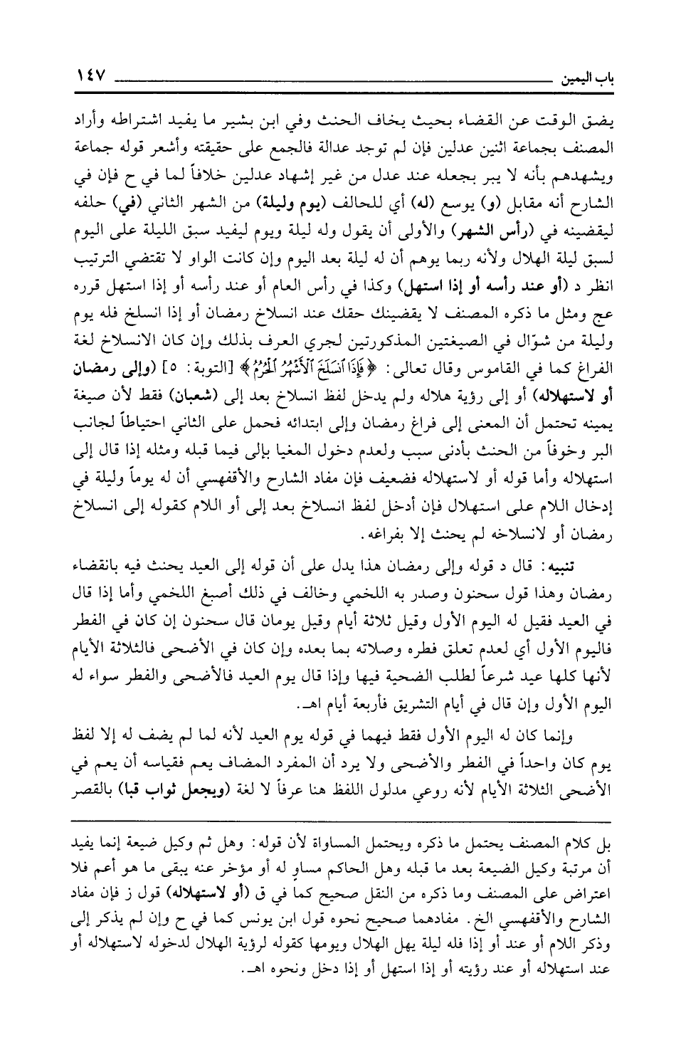 تنبيه: قال د قوله وإلى رمضان هذا يدل على أن قوله إلى العيد يحنث فيه بانقضاء رمضان وهذا قول سحنون وصدر به اللخمي وخالف في ذلك أصبغ اللخمي وأما إذا قال في العيد فقيل له اليوم الأول وقيل ثلاثة أيام وقيل يومان قال سحنون إن كان في الفطر فاليوم الأول أي لعدم تعلق فطره وصلاته بما بعده وإن كان في الأضحى فالثلاثة الأيام لأنها كلها عيد شرعًا لطلب الضحية فيها وإذا قال يوم العيد فالأضحى والفطر سواء له اليوم الأول وإن قال في أيام التشريق فأربعة أيام اهـ.