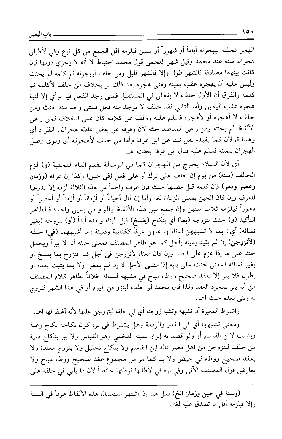 أي لأن السلام يخرج من الهجران كما في الرسالة بضم الياء التحتية (و) لزم الحالف (سنة) من يوم إن حلف على ترك أو على فعل (في حين) وكذا إن عرفه (وزمان وعصر ودهر) فإن كلمه قبل مضيها حنث فإن عرف واحدًا من هذه الثلاثة لزمه إلا بدرعيا للعرف وإن كان الحين بمعنى الزمان لغة وأما إن قال أحيانًا أو أزمانًا أو أزمنًا أو أعصرًا أو دهورًا فيلزمه ثلاث سنين وإن جمع بين هذه الألفاظ بالواو في يمين واحدة فالظاهر التأكيد (و) حنث بتزوجه (بما) أي بنكاح (يفسخ) قبل البناء وبعده أبدًا (أو) بتزوجه (بغير نسائه) أي: بما لا تشبههن لدناءتها عنهن عرفًا ككتابية ودنيئة وما أشبههما (في) حلفه (لأتزوجن) إن لم يقيد يمينه بأجل كما هو ظاهر المصنف فمعنى حنثه أنه لا يبرأ ويحمل حنثه على ما إذا عزم على الضد وإن كان معناه لأتزوجن في أجل كذا فتزوج بما يفسخ أو بغير نسائه فمعنى حنث على بابه إذا مضى الأجل لا إن لم يمض ولا بما يثبت بعده أو بطول فلا يبر إلا بعقد صحيح ووطء مباح في مشبهة لنسائه خلافًا لظاهر كلام المصنف من أنه يبر بمجرد العقد ولذا قال محمَّد لو حلف ليتزوجن اليوم أو في هذا الشهر فتزوج به وبنى بعده حنث اهـ.