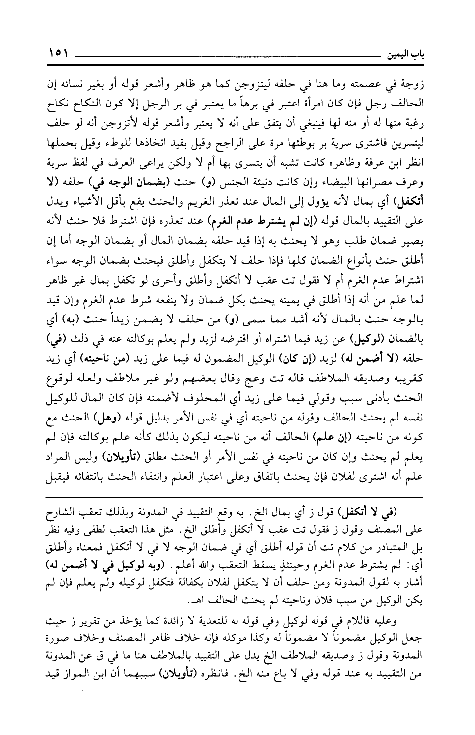 زوجة في عصمته وما هنا في حلفه ليتزوجن كما هو ظاهر وأشعر قوله أو بغير نسائه إن الحالف رجل فإن كان امرأة اعتبر في برها ما يعتبر في بر الرجل إلا كون النكاح نكاح رغبة منها له أو منه لها فينبغي أن يتفق على أنه لا يعتبر وأشعر قوله لأتزوجن أنه لو حلف ليتسرين فاشترى سرية بر بوطئها مرة على الراجح وقيل بقيد اتخاذها للوطء وقيل بحملها انظر ابن عرفة وظاهره كانت تشبه أن يتسرى بها أم لا ولكن يراعى العرف في لفظ سرية وعرت مصرانها البيضاء وإن كانت دنيئة الجنس (و) حنث (بضمان الوجه في) حلفه (لا أتكفل) أي بمال لأنه يؤول إلى المال عند تعذر الغريم والحنث يقع بأقل الأشياء ويدل على التقييد بالمال قوله (إن لم يشترط عدم الغرم) عند تعذره فإن اشترط فلا حنث لأنه يصير ضمان طلب وهو لا يحنث به إذا قيد حلفه بضمان المال أو بضمان الوجه أما إن أطلق حنث بأنواع الضمان كلها فإذا حلف لا يتكفل وأطلق فيحنث بضمان الوجه سواء اشتراط عدم الغرم أم لا فقول تت عقب لا أتكفل وأطلق وأحرى لو تكفل بمال غير ظاهر لما علم من أنه إذا أطلق في يمينه يحنث بكل ضمان ولا ينفعه شرط عدم الغرم وإن قيد بالوجه حنث بالمال لأنه أشد مما سمى (و) من حلف لا يضمن زيدًا حنث (به) أي بالضمان الوكيل) عن زيد فيما اشتراه أو اقترضه لزيد ولم يعلم بوكالته عنه في ذلك (في) حلفه (لا أضمن له) لزيد (إن كان) الوكيل المضمون له فيما على زيد (من ناحيته) أي زيد كقريبه وصديقه الملاطف قاله تت وعج وقال بعضهم ولو غير ملاطف ولعله لوقوع الحنث بأدنى سبب وقولي فيما على زيد أي المحلوف لأضمنه فإن كان المال للوكيل نفسه لم يحنث الحالف وقوله من ناحيته أي في نفس الأمر بدليل قوله (وهل) الحنث مع كونه من ناحيته (إن علم) الحالف أنه من ناحيته ليكون بذلك كأنه علم بوكالته فإن لم يعلم لم يحنث وإن كان من ناحيته في نفس الأمر أو الحنث مطلق (تأويلان) وليس المراد علم أنه اشترى لفلان فإن يحنث باتفاق وعلى اعتبار العلم وانتفاء الحنث بانتفائه فيقبل