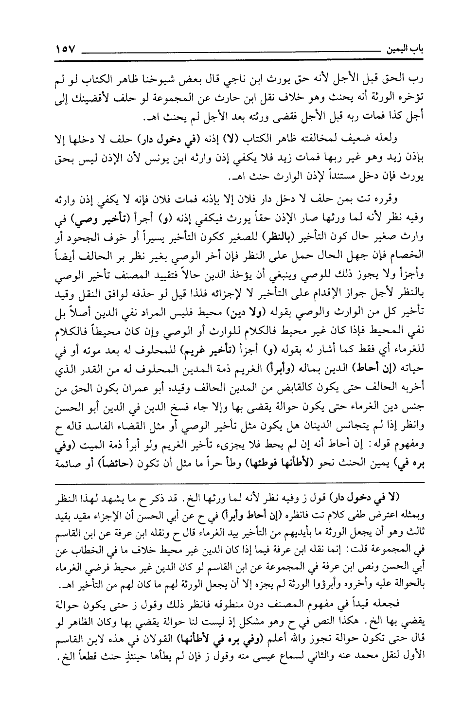 وقرره تت بمن حلف لا دخل دار فلان إلا بإذنه فمات فلان فإنه لا يكفي إذن وارثه وفيه نظر لأنه لما ورثها صار الإذن حقًّا يورث فيكفي إذنه (و) أجرًا (تأخير وصي) في وارث صغير حال كون التأخير (بالنظر) للصغير ككون التأخير يسيرًا أو خوف الجحود أو الخصام فإن جهل الحال حمل على النظر فإن أخر الوصي بغير نظر بر الحالف أيضًا وأجزأ ولا يجوز ذلك للوصي وينبغي أن يؤخذ الدين حالًا فتقييد المصنف تأخير الوصي بالنظر لأجل جواز الإقدام على التأخير لا لإجزائه فلذا قيل لو حذفه لوافق النقل وقيد تأخير كل من الوارث والوصي بقوله (ولا دين) محيط فليس المراد نفي الدين أصلًا بل نفي المحيط فإذا كان غير محيط فالكلام للوارث أو الوصي وإن كان محيطًا فالكلام للغرماء أي فقط كما أشار له بقوله (و) أجزأ (تأخير غريم) للمحلوف له بعد موته أو في حياته (إن أحاط) الدين بماله (وأبرأ) الغريم ذمة المدين المحلوف له من القدر الذي أخربه الحالف حتى يكون كالقابض من المدين الحالف وقيده أبو عمران يكون الحق من جنس دين الغرماء حتى يكون حوالة يقضى بها وإلا جاء فسخ الدين في الدين أبو الحسن وانظر إذا لم يتجانس الدينان هل يكون مثل تأخير الوصي أو مثل القضاء الفاسد قاله ح ومفهوم قوله: إن أحاط أنه إن لم يحط فلا يجزئ تأخير الغريم ولو أبرأ ذمة الميت (وفي بره في) يمين الحنث نحو (لأطأنها فوطئها) وطأ حرًّا ما مثل أن تكون (حائضًا) أو صائمة
