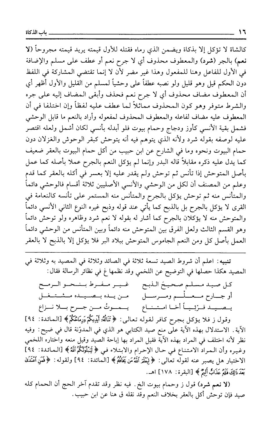 كالشاة لا تؤكل إلا بذكاة ويضمن الذي رماه فقتله للأول قيمته يريد قيمته مجروحًا (لا نعم) بالجر (شرد) والمعطوف محذوف أي لا جرح نعم أو عطف على مسلم والإضافة في الأول للفاعل وهنا للمفعول وهذا غير مضر لأن لا إنما تقتضي المشاركة في اللفظ دون الحكم قيل وهو قليل ولو نصبه عطفًا على وحشيًّا لمسلم من القليل والأول أظهر أي أن المعطوف مضاف محذوف أي لا جرح نعم فحذف وأبقى المضاف إليه على جره والشرط متوفر وهو كون المحذوف مماثلًا لما عطف عليه لفظًا وإن اختلفا في أن المعطوف عليه مضاف لفاعله والمعطوف المحذوف لمفعوله وأراد بالنعم ما قابل الوحشي فشمل بقية الإنسي كأوز ودجاج وحمام بيوت فلو أبدله بإنسي لكان أشمل ولعله اقتصر عليه لوصفه بقوله شرد ولأنه الذي يتوهم فيه أنه يتوحش كبقر الوحوش والغزلان دون حمام البيوت ونحوه وما في الشارح عن ابن حبيب من أكل حمام البيوت بالعقر ضعيف كما يدل عليه ذكره مقابلًا قاله البدر وإنما لم يؤكل النعم بالجرح عملا بأصله كما عمل بأصل المتوحش إذا تأنس ثم توحش ولم يقدر عليه إلا بعسر في أكله بالعقر كما قدم وعلم من المصنف أن لكل من الوحشي والإنسي الأصليين ثلاثة أقسام فالوحشي دائمًا والمتأنس منه ثم توحش يؤكل بالجرح والمتأنس منه المستمر على تأنسه كالنعامة في القرى لا يؤكل بالجرح بل بالذبح كما يأتي عند قوله وذبح غيره النوع الثاني الإنسي دائمًا والمتوحش منه لا يؤكلان بالجرح كما أشار له بقوله لا نعم شرد وظاهره ولو توحش دائمًا وهو القسم الثالث ولعل الفرق بين المتوحش منه دائمًا وبين المتأنس من الوحشي دائمًا العمل بأصل كل ومن النعم الجاموس المتوحش ببلاد البر فلا يؤكل إلا بالذبح لا بالعقر