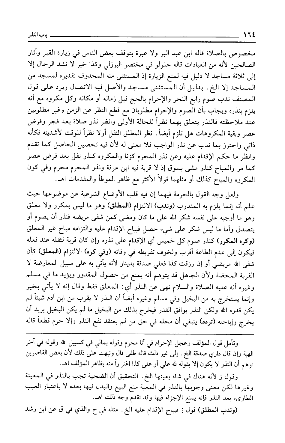 مخصوص بالصلاة قاله ابن عبد البر ولا عبرة بتوقف بعض الناس في زيارة القبر وآثار الصالحين لأنه من العبادات قاله حلولو في مختصر البرزلي وكذا خبر لا تشد الرحال إلا إلى ثلاثة مساجد لا دليل فيه لمنع الزيارة إذ المستثنى منه المحذوف تقديره لمسجد من المساجد إلا الخ. بدليل أن المستثنى مساجد والأصل فيه الاتصال ويرد على قول المصنف ندب صوم رابع النحر والإحرام بالحج قبل زمانه أو مكانه وكل مكروه مع أنه يلزم بنذره ويجاب بأن الصوم والإحرام مطلوبان مع قطع النظر عن الزمن وغير مطلوبين عند ملاحظته فالنذر يتعلق بهما نظرًا للحالة الأولى وانظر نذر صلاة بعد فجر وفرض عصر وبقية المكروهات هل تلزم أيضًا. نظر المطلق النفل أولًا نظرًا للوقت لأشديته فكأنه ذاتي واحترز بما ندب عن نذر الواجب فلا معنى له لأن فيه تحصيل الحاصل كما تقدم وانظر ما حكم الإقدام عليه وعن نذر المحرم كزنا والمكروه كنذر نفل بعد فرض عصر كما مر والمباح كنذر مشى بسوق إذ لا قربة فيه ابن عرفة ونذر المحرم محرم وفي كون المكروه والمباح كذلك أو مثلهما قولًا الأكثر مع ظاهر الموطأ والمقدمات اهـ.