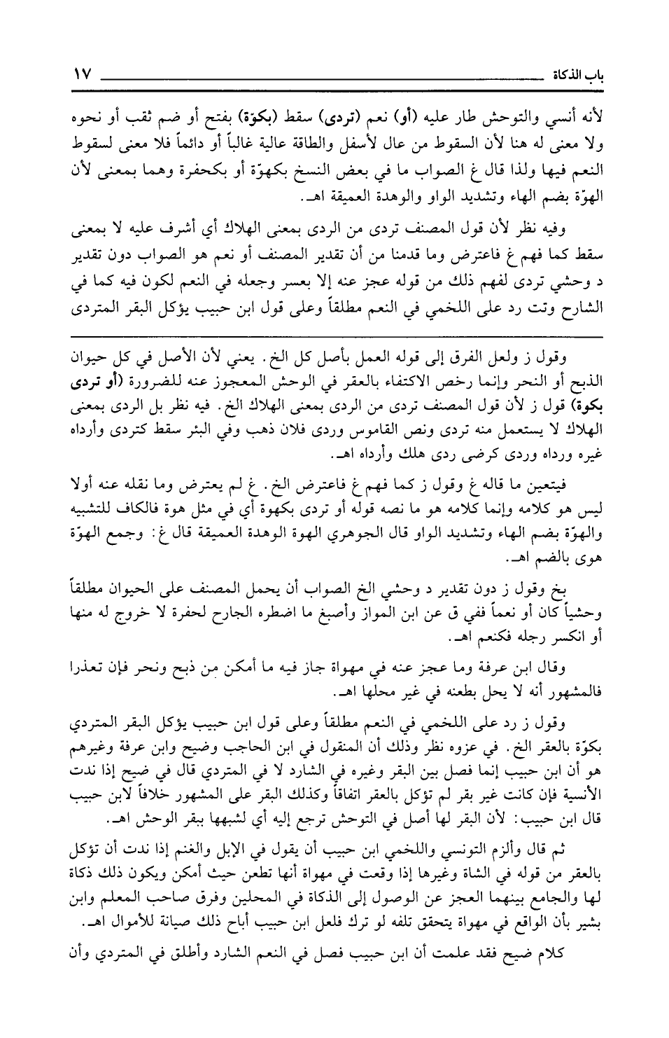 وقول ز رد على اللخمي في النعم مطلقًا وعلى قول ابن حبيب يؤكل البقر المتردي بكوّة بالعقر الخ. في عزوه نظر وذلك أن المنقول في ابن الحاجب وضيح وابن عرفة وغيرهم هو أن ابن حبيب إنما فصل بين البقر وغيره في الشارد لا في المتردي قال في ضيح إذا ندت الإنسية فإن كانت غير بقر لم تؤكل بالعقر اتفاقًا وكذلك البقر على المشهور خلافًا لابن حبيب قال ابن حبيب: لأن البقر لها أصل في التوحش ترجع إليه أي لشبهها ببقر الوحش اهـ.