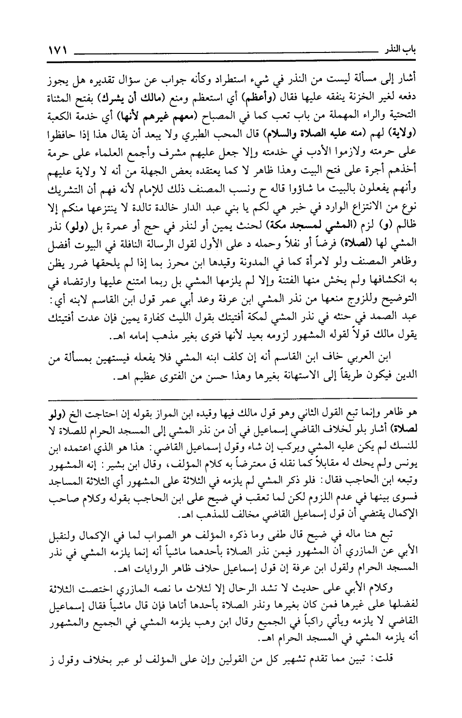 وكلام الأبي على حديث لا تشد الرحال إلا لثلاث ما نصه المازري اختصت الثلاثة لفضلها على غيرها فمن كان بغيرها ونذر الصلاة بأحدها أتاها فإن قال ماشيًا فقال إسماعيل القاضي لا يلزمه ويأتي راكبًا في الجميع وقال ابن وهب يلزمه المشي في الجميع والمشهور أنه يلزمه المشي في المسجد الحرام اهـ.