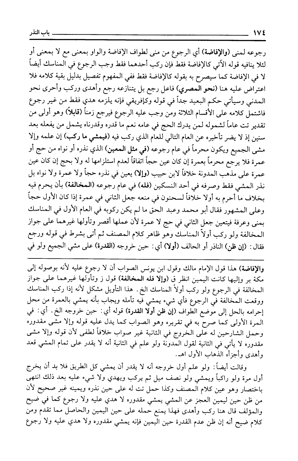 رجوعه لمنى (والإفاضة) أي الرجوع من منى لطواف الإفاضة والواو بمعنى مع لا بمعنى أو لئلا ينافيه قوله الآتي كالإفاضة فقط فإن ركب أحدهما فقط وجب الرجوع في المناسك أيضًا لا في الإفاضة كما سيصرح به بقوله كالإفاضة فقط ففي المفهوم تفصيل بدليل بقية كلامه فلا اعتراض عليه هنا (نحو المصري) فاعل رجع بل يتنازعه رجع وأهدى وركب وأحرى نحو المدني وسيأتي حكم البعيد جدًّا في قوله وكإفريقي فإنه يلزمه هدي فقط من غير رجوع فاشتمل كلامه على الأقسام الثلاثة ومن وجب عليه الرجوع فيرجع زمنًا (قابلًا) وهو أولى من تقدير تت عامًّا لشموله لمن يدرك الحج في عامه نعم ما قدره وقدرناه يشمل من يفعله بعد سنين إذ لا يضر تأخيره عن العام التالي للعام الذي ركب فيه (فيمشي ما ركب) إن علمه وإلا مشى الجميع ويكون محرمًا في عام رجوعه (في مثل المعين) الذي نذره أو نواه من حج أو عمرة فلا يرجع محرمًا بعمرة إن كان عين حجًّا اتفاقًا لعدم استلزامها له ولا بحج إن كان عين عمرة على مذهب المدونة خلافًا لابن حبيب (وإلا) يعين في نذره حجًّا ولا عمرة ولا نواه بل نذر المشي فقط وصرفه في أحد النسكين (فله) في عام رجوعه (المخالفة) بأن يحرم فيه بخلاف ما أحرم به أولا خلافًا لسحنون في منعه جعل الثاني في عمرة إذا كان الأول حجًّا وعلى المشهور فقال أبو محمَّد وعبد الحق ما لم يكن ركوبه في العام الأول في المناسك بمنى وعرفة فيتعين جعل الثاني في حج لا عمرة لأن عملها أقصر وتأولها غيرهما على جواز المخالفة ولو ركب أولًا المناسك وهو ظاهر كلام المصنف ثم أتى بشرط في قوله ورجع فقال: (إن ظن) الناذر أو الحالف (أولًا) أي: حين خروجه (القدرة) على مشي الجميع ولو في