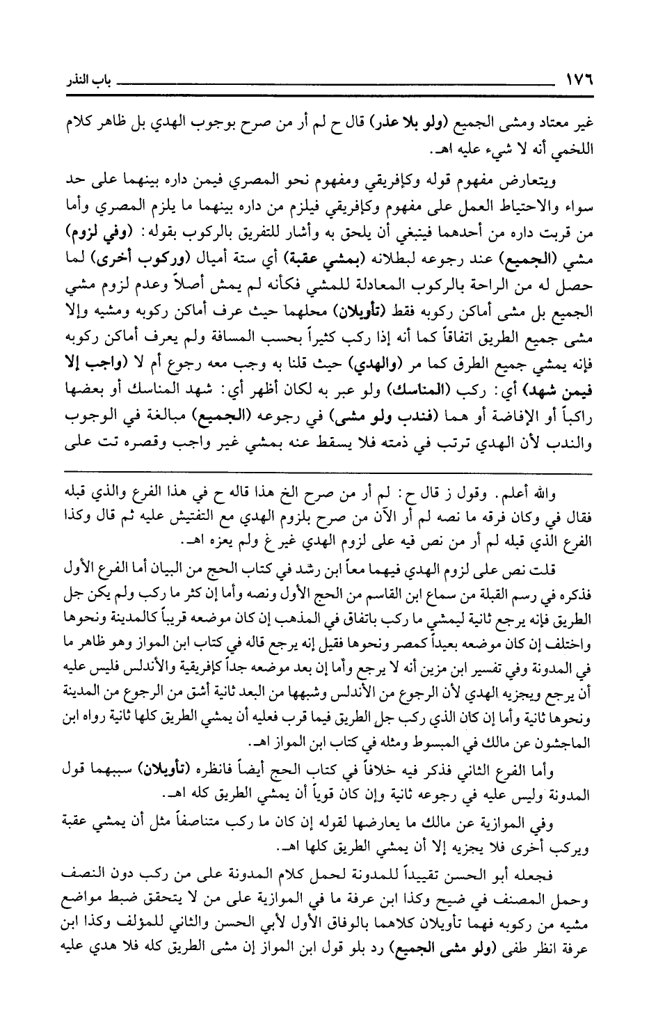 ويتعارض مفهوم قوله وكإفريقي ومفهوم نحو المصري فيمن داره بينهما على حد سواء والاحتياط العمل على مفهوم وكإفريقي فيلزم من داره بينهما ما يلزم المصري وأما من قربت داره من أحدهما فينبغي أن يلحق به وأشار للتفريق بالركوب بقوله: (وفي لزوم) مشي (الجميع) عند رجوعه لبطلانه (بمشي عقبة) أي ستة أميال (وركوب أخرى) لما حصل له من الراحة بالركوب المعادلة للمشي فكأنه لم يمش أصلًا وعدم لزوم مشي الجميع بل مشى أماكن ركوبه فقط (تأويلان) محلهما حيث عرف أماكن ركوبه ومشيه وإلا مشى جميع الطريق اتفاقًا كما أنه إذا ركب كثيرًا بحسب المسافة ولم يعرف أماكن ركوبه فإنه يمشي جميع الطرق كما مر (والهدي) حيث قلنا به وجب معه رجوع أم لا (واجب إلا فيمن شهد) أي: ركب (المناسك) ولو عبر به لكان أظهر أي: شهد المناسك أو بعضها راكبًا أو الإفاضة أو هما (فندب ولو مشى) في رجوعه (الجميع) مبالغة في الوجوب والندب لأن الهدي ترتب في ذمته فلا يسقط عنه بمشي غير واجب وقصره تت على