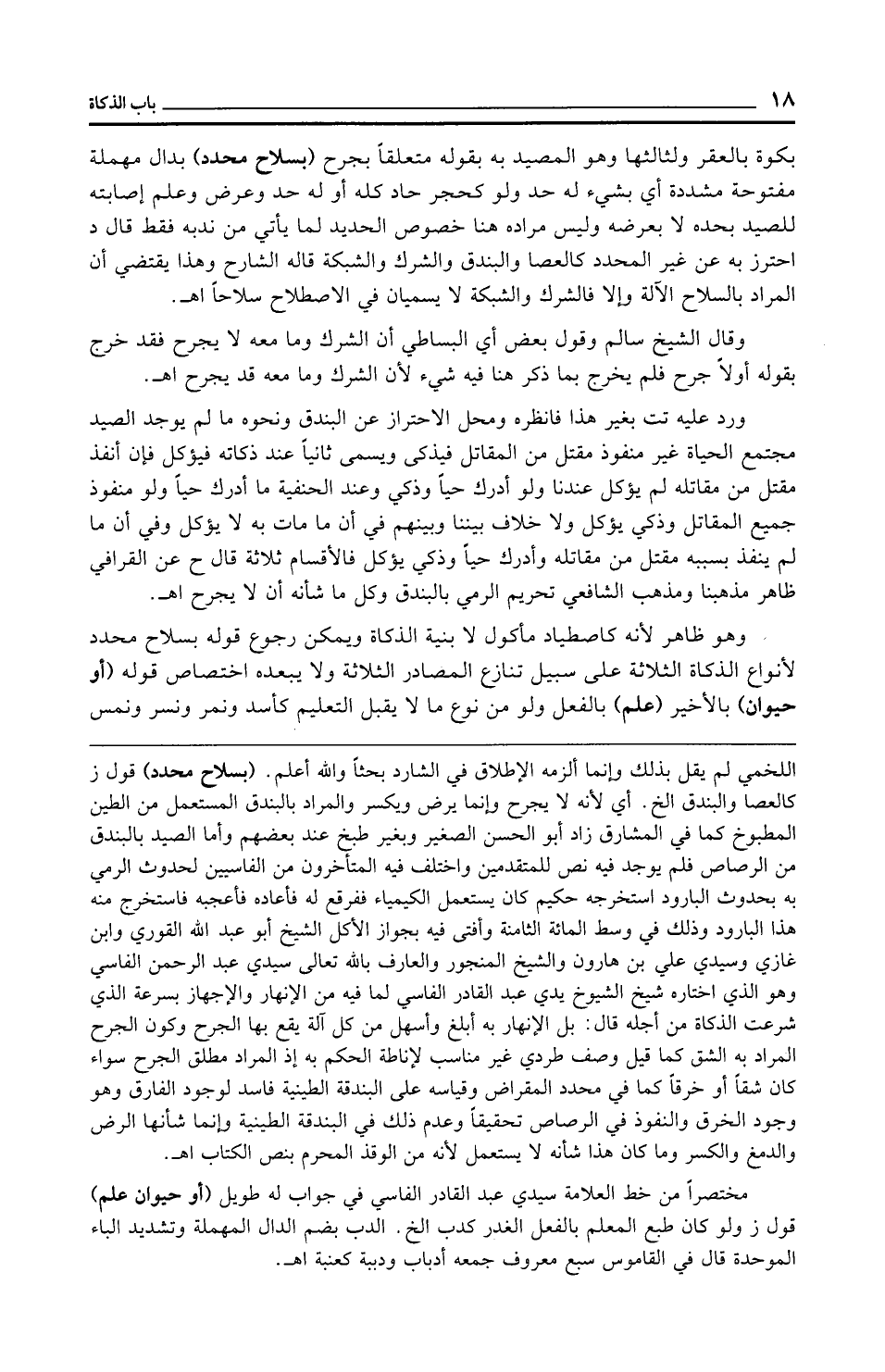 اللخمي لم يقل بذلك وإنما ألزمه الإطلاق في الشارد بحثًا والله أعلم. (بسلاح محدد) قول ز كالعصا والبندق الخ. أي لأنه لا يجرح وإنما يرض ويكسر والمراد بالبندق المستعمل من الطين المطبوخ كما في المشارق زاد أبو الحسن الصغير وبغير طبخ عند بعضهم وأما الصيد بالبندق من الرصاص فلم يوجد فيه نص للمتقدمين واختلف فيه المتأخرون من الفاسيين لحدوث الرمي به بحدوث البارود استخرجه حكيم كان يستعمل الكيمياء ففرقع له فأعاده فأعجبه فاستخرج منه هذا البارود وذلك في وسط المائة الثامنة وأفتى فيه بجواز الأكل الشيخ أبو عبد الله القوري وابن غازي وسيدي علي بن هارون والشيخ المنجور والعارف بالله تعالى سيدي عبد الرحمن الفاسي وهو الذي اختاره شيخ الشيوخ يدي عبد القادر الفاسي لما فيه من الإنهار والإجهاز بسرعة الذي شرعت الذكاة من أجله قال: بل الإنهار به أبلغ وأسهل من كل آلة يقع بها الجرح وكون الجرح المراد به الشق كما قيل وصف طردي غير مناسب لإناطة الحكم به إذ المراد مطلق الجرح سواء كان شقًّا أو خرقًا كما في محدد المقراض وقياسه على البندقة الطينية فاسد لوجود الفارق وهو وجود الخرق والنفوذ في الرصاص تحقيقًا وعدم ذلك في البندقة الطينية وإنما شأنها الرض والدمغ والكسر وما كان هذا شأنه لا يستعمل لأنه من الوقذ المحرم بنص الكتاب اهـ.