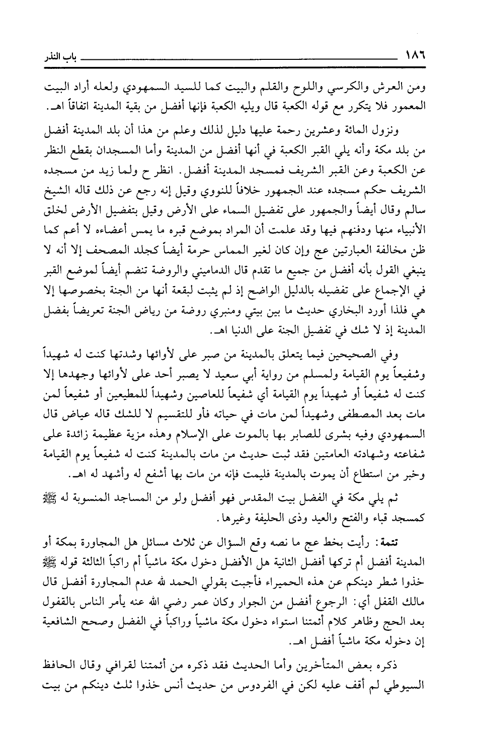 ونزول المائة وعشرين رحمة عليها دليل لذلك وعلم من هذا أن بلد المدينة أفضل من بلد مكة وأنه يلي القبر الكعبة في أنها أفضل من المدينة وأما المسجدان بقطع النظر عن الكعبة وعن القبر الشريف فمسجد المدينة أفضل. انظر ح ولما زيد من مسجده الشريف حكم مسجده عند الجمهور خلافًا للنووي وقيل إنه رجع عن ذلك قاله الشيخ سالم وقال أيضًا والجمهور على تفضيل السماء على الأرض وقيل بتفضيل الأرض لخلق الأنبياء منها ودفنهم فيها وقد علمت أن المراد بموضع قبره ما يمس أعضاءه لا أعم كما ظن مخالفة العبارتين عج وإن كان لغير المماس حرمة أيضًا كجلد المصحف إلا أنه لا ينبغي القول بأنه أفضل من جميع ما تقدم قال الدماميني والروضة تنضم أيضًا لموضع القبر في الإجماع على تفضيله بالدليل الواضح إذ لم يثبت لبقعة أنها من الجنة بخصوصها إلا هي فلذا أورد البخاري حديث ما بين بيتي ومنبري روضة من رياض الجنة تعريضًا بفضل المدينة إذ لا شك في تفضيل الجنة على الدنيا اهـ.