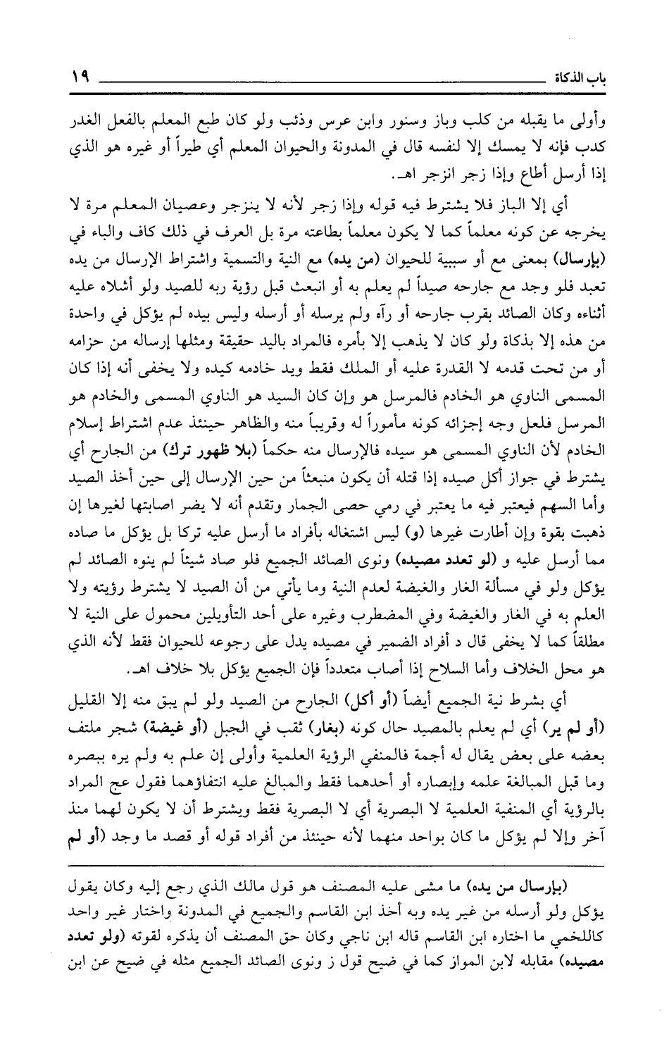 (بإرسال من يده) ما مشى عليه المصنف هو قول مالك الذي رجع إليه وكان يقول يؤكل ولو أرسله من غير يده وبه أخذ ابن القاسم والجميع في المدونة واختار غير واحد كاللخمي ما اختاره ابن القاسم قاله ابن ناجي وكان حق المصنف أن يذكره لقوته (ولو تعدد مصيده) مقابله لابن المواز كما في ضيح قول ز ونوى الصائد الجميع مثله في ضيح عن ابن