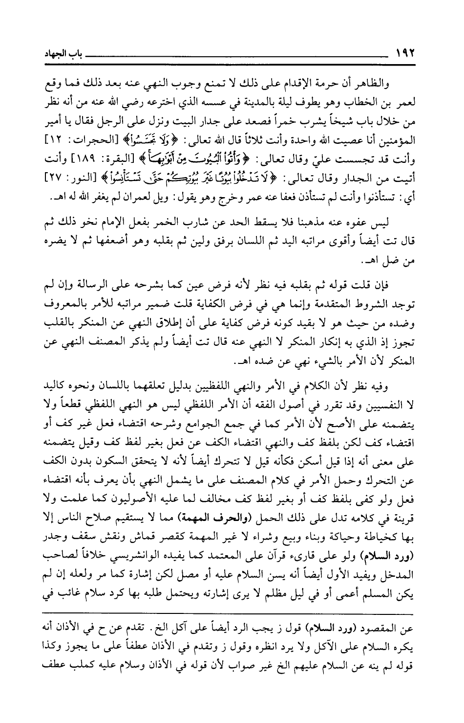 والظاهر أن حرمة الإقدام على ذلك لا تمنع وجوب النهي عنه بعد ذلك فما وقع لعمر بن الخطاب وهو يطوف ليلة بالمدينة في عسسه الذي اخترعه رضي الله عنه من أنه نظر من خلال باب شيخًا يشرب خمرًا فصعد على جدار البيت ونزل على الرجل فقال يا أمير المؤمنين أنا عصيت الله واحدة وأنت ثلاثًا قال الله تعالى: {وَلَا تَجَسَّسُوا} [الحجرات: 12] وأنت قد تجسست عليّ وقال تعالى: {وَأْتُوا الْبُيُوتَ مِنْ أَبْوَابِهَا} [البقرة: 189] وأنت أتيت من الجدار وقال تعالى: {لَا تَدْخُلُوا بُيُوتًا غَيْرَ بُيُوتِكُمْ حَتَّى تَسْتَأْنِسُوا} [النور: 27] أي: تستأذنوا وأنت لم تستأذن فعفا عنه عمر وخرج وهو يقول: ويل لعمران لم يغفر الله له اهـ.
