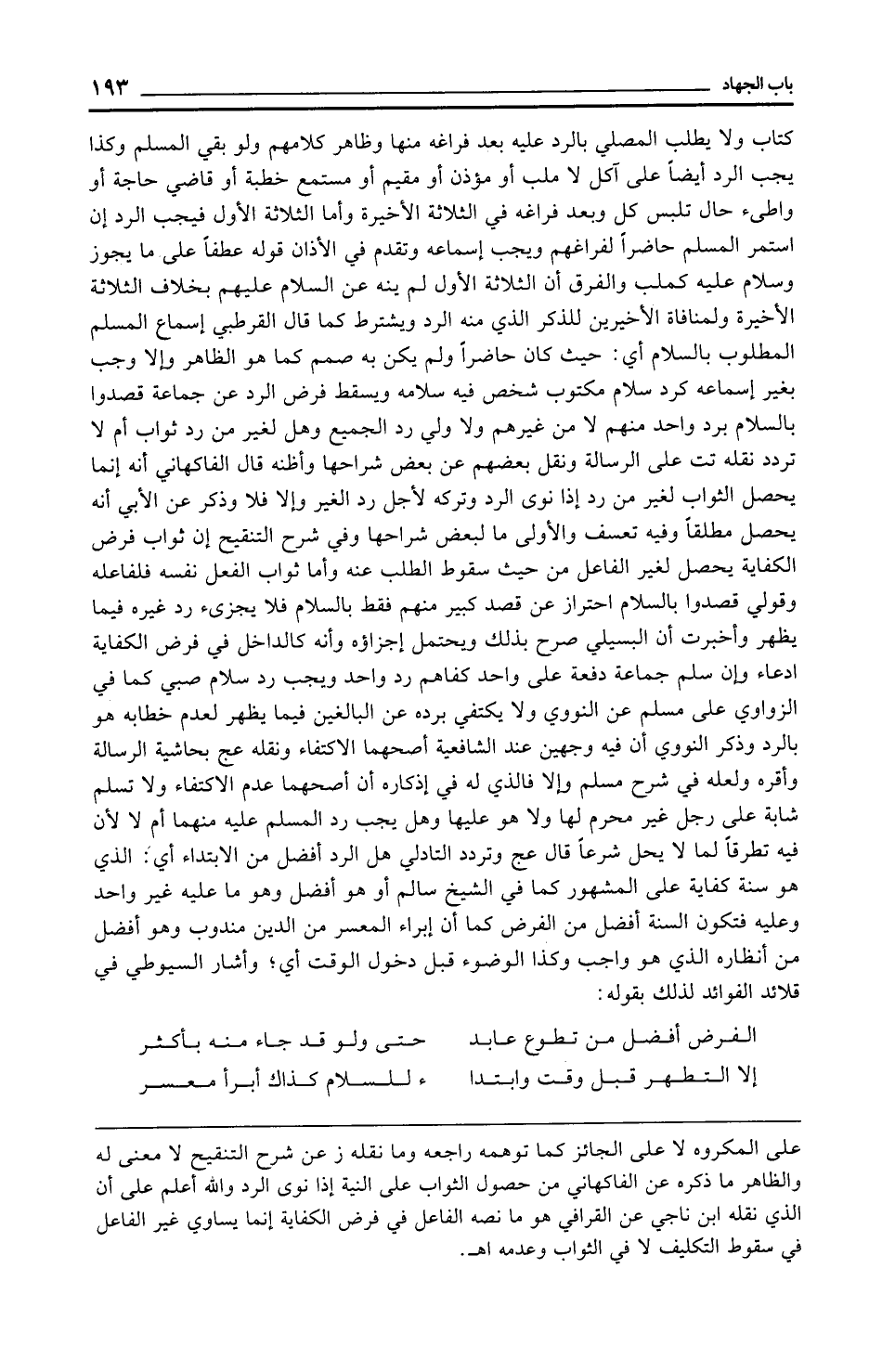 على المكروه لا على الجائز كما توهمه راجعه وما نقله ز عن شرح التنقيح لا معنى له والظاهر ما ذكره عن الفاكهاني من حصول الثواب على النية إذا نوى الرد والله أعلم على أن الذي نقله ابن ناجي عن القرافي هو ما نصه الفاعل في فرض الكفاية إنما يساوي غير الفاعل في سقوط التكليف لا في الثواب وعدمه اهـ.