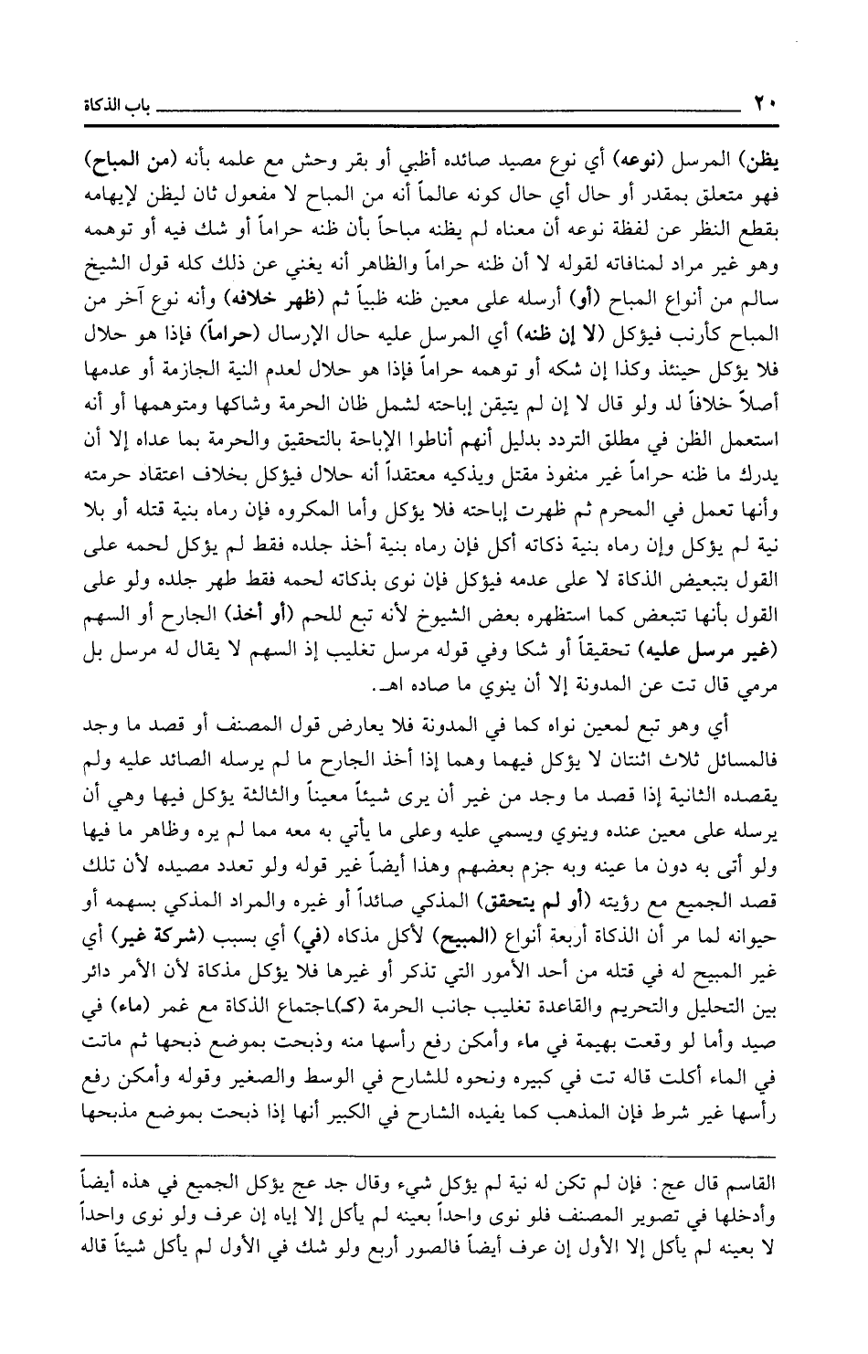 يظن) المرسل (نوعه) أي نوع مصيد صائده أظبي أو بقر وحش مع علمه بأنه (من المباح) فهو متعلق بمقدر أو حال أي حال كونه عالمًا أنه من المباح لا مفعول ثان ليظن لإيهامه بقطع النظر عن لفظة نوعه أن معناه لم يظنه مباحًا بأن ظنه حرامًا أو شك فيه أو توهمه وهو غير مراد لمنافاته لقوله لا أن ظنه حرامًا والظاهر أنه يغني عن ذلك كله قول الشيخ سالم من أنواع المباح (أو) أرسله على معين ظنه ظبيًا ثم (ظهر خلافه) وأنه نوع آخر من المباح كأرنب فيؤكل (لا إن ظنه) أي المرسل عليه حال الإرسال (حرامًا) فإذا هو حلال فلا يؤكل حينئذ وكذا إن شكه أو توهمه حرامًا فإذا هو حلال لعدم النية الجازمة أو عدمها أصلًا خلافًا لد ولو قال لا إن لم يتيقن إباحته لشمل ظان الحرمة وشاكها ومتوهمها أو أنه استعمل الظن في مطلق التردد بدليل أنهم أناطوا الإباحة بالتحقيق والحرمة بما عداه إلا أن يدرك ما ظنه حرامًا غير منفوذ مقتل ويذكيه معتقدًا أنه حلال فيؤكل بخلاف اعتقاد حرمته وأنها تعمل في المحرم ثم ظهرت إباحته فلا يؤكل وأما المكروه فإن رماه بنية قتله أو بلا نية لم يؤكل وإن رماه بنية ذكاته أكل فإن رماه بنية أخذ جلده فقط لم يؤكل لحمه على القول بتبعيض الذكاة لا على عدمه فيؤكل فإن نوى بذكاته لحمه فقط طهر جلده ولو على القول بأنها تتبعض كما استظهره بعض الشيوخ لأنه تبع للحم (أو أخذ) الجارح أو السهم (غير مرسل عليه) تحقيقًا أو شكا وفي قوله مرسل تغليب إذ السهم لا يقال له مرسل بل مرمي قال تت عن المدونة إلا أن ينوي ما صاده اهـ.