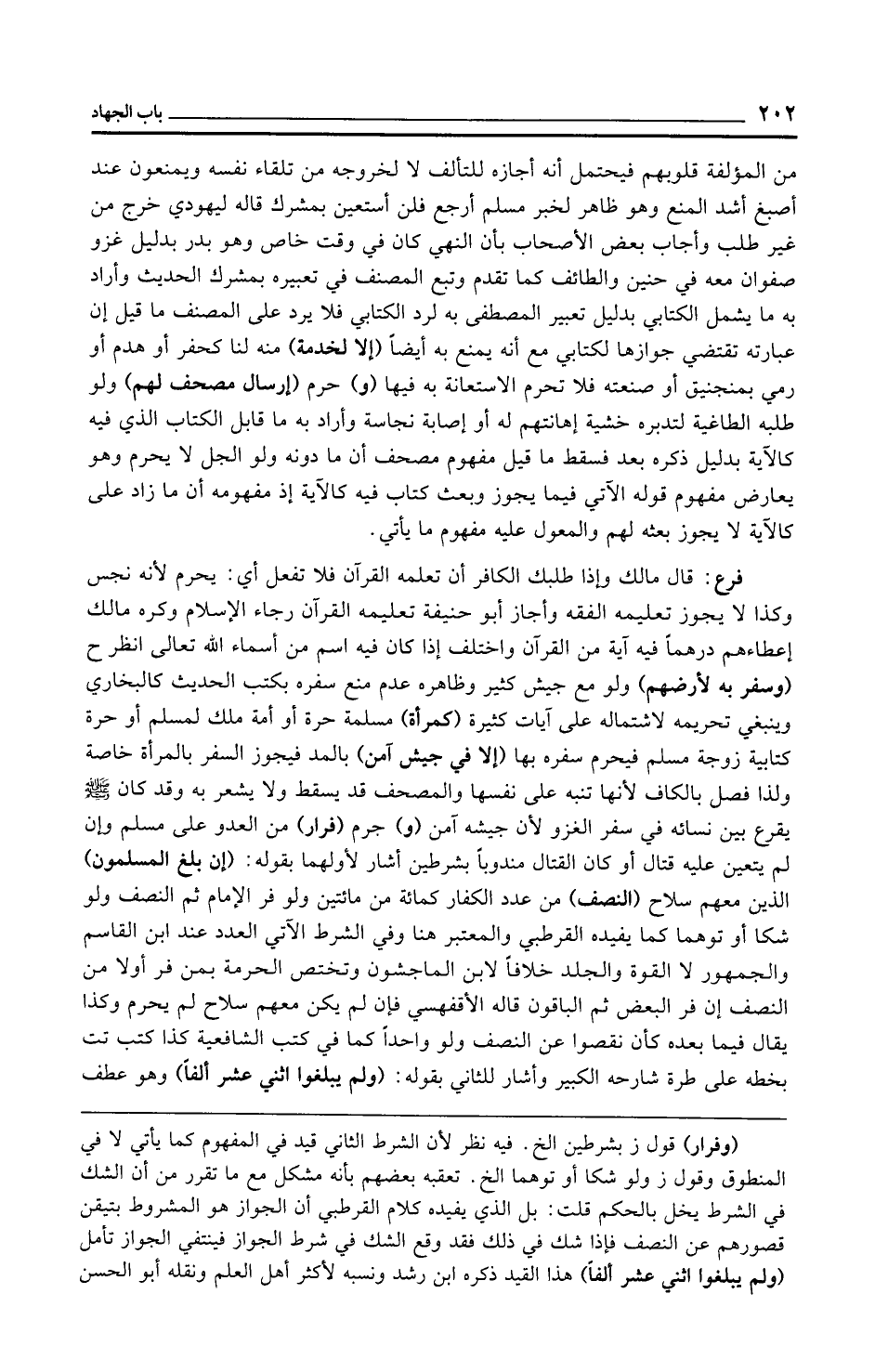 فرع: قال مالك وإذا طلبك الكافر أن تعلمه القرآن فلا تفعل أي: يحرم لأنه نجس وكذا لا يجوز تعليمه الفقه وأجاز أبو حنيفة تعليمه القرآن رجاء الإِسلام وكره مالك إعطاءهم درهمًا فيه آية من القرآن واختلف إذا كان فيه اسم من أسماء الله تعالى انظر ح (وسفر به لأرضهم) ولو مع جيش كثير وظاهره عدم منع سفره بكتب الحديث كالبخاري وينبغي تحريمه لاشتماله على آيات كثيرة (كمرأة) مسلمة حرة أو أمة ملك لمسلم أو حرة كتابية زوجة مسلم فيحرم سفره بها (إلا في جيش آمن) بالمد فيجوز السفر بالمرأة خاصة ولذا فصل بالكاف لأنها تنبه على نفسها والمصحف قد يسقط ولا يشعر به وقد كان - صلى الله عليه وسلم - يقرع بين نسائه في سفر الغزو لأن جيشه آمن (و) جرم (فرار) من العدو على مسلم وإن لم يتعين عليه قتال أو كان القتال مندوبًا بشرطين أشار لأولهما بقوله: (إن بلغ المسلمون) الذين معهم سلاح (النصف) من عدد الكفار كمائة من مائتين ولو فر الإِمام ثم النصف ولو شكا أو توهما كما يفيده القرطبي والمعتبر هنا وفي الشرط الآتي العدد عند ابن القاسم والجمهور لا القوة والجلد خلافًا لابن الماجشون وتختص الحرمة بمن فر أولا من النصف إن فر البعض ثم الباقون قاله الأقفهسي فإن لم يكن معهم سلاح لم يحرم وكذا يقال فيما بعده كأن نقصوا عن النصف ولو واحدًا كما في كتب الشافعية كذا كتب تت بخطه على طرة شارحه الكبير وأشار للثاني بقوله: (ولم يبلغوا اثني عشر ألفًا) وهو عطف