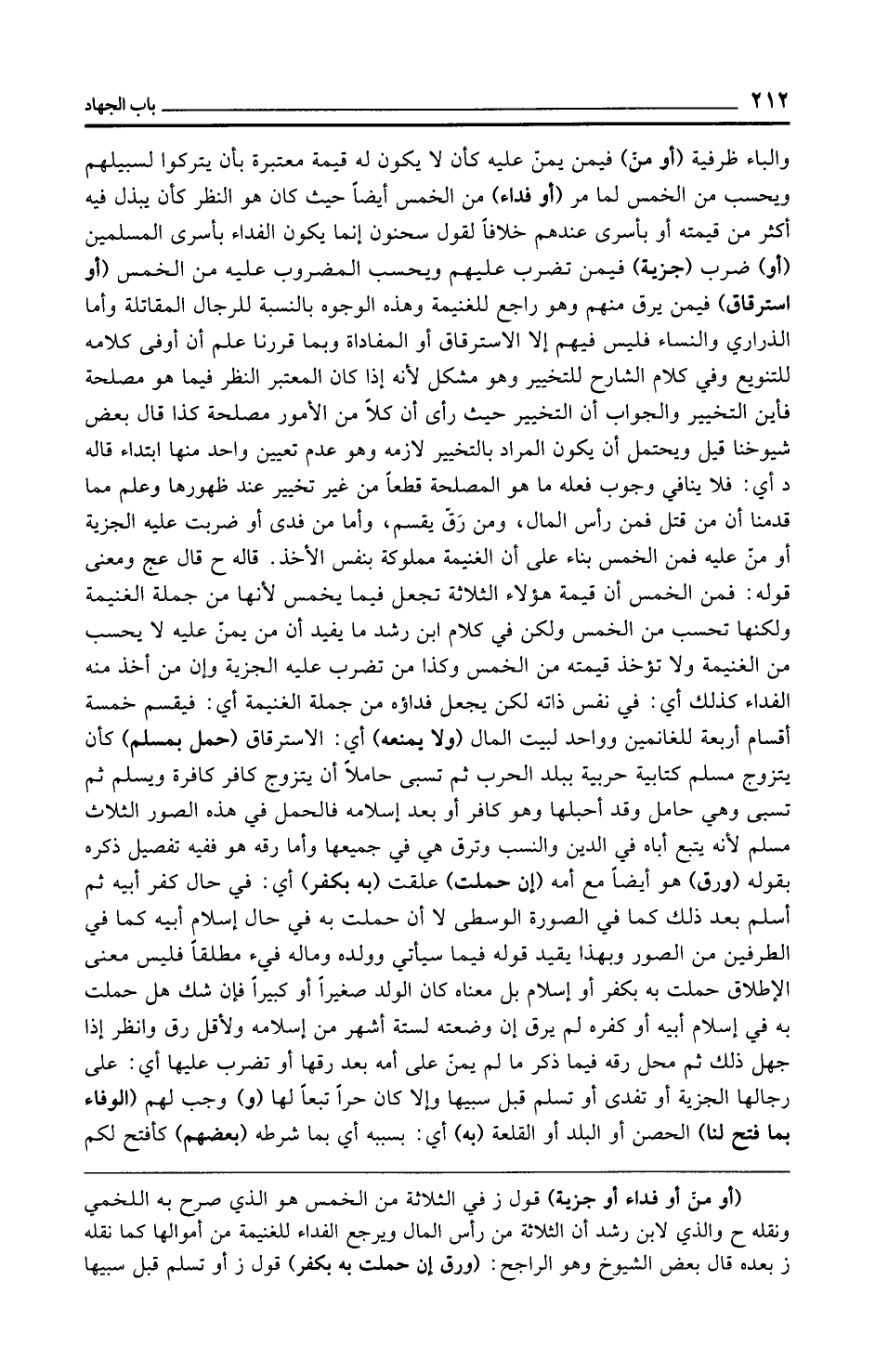 والباء ظرفية (أو منّ) فيمن يمنّ عليه كأن لا يكون له قيمة معتبرة بأن يتركوا لسبيلهم ويحسب من الخمس لما مر (أو فداء) من الخمس أيضًا حيث كان هو النظر كان يبذل فيه أكثر من قيمته أو بأسرى عندهم خلافًا لقول سحنون إنما يكون الفداء بأسرى المسلمين (أو) ضرب (جزية) فيمن تضرب عليهم ويحسب المضروب عليه من الخمس (أو استرقاق) فيمن يرق منهم وهو راجع للغنيمة وهذه الوجوه بالنسبة للرجال المقاتلة وأما الذراري والنساء فليس فيهم إلا الاسترقاق أو المفاداة وبما قررنا علم أن أوفى كلامه للتنويع وفي كلام الشارح للتخيير وهو مشكل لأنه إذا كان المعتبر النظر فيما هو مصلحة فأين التخيير والجواب أن التخيير حيث رأى أن كلًّا من الأمور مصلحة كذا قال بعض شيوخنا قيل ويحتمل أن يكون المراد بالتخيير لازمه وهو عدم تعيين واحد منها ابتداء قاله د أي: فلا ينافي وجوب فعله ما هو المصلحة قطعًا من غير تخيير عند ظهورها وعلم مما قدمنا أن من قتل فمن رأس المال، ومن رَقّ يقسم، وأما من فدى أو ضربت عليه الجزية أو من عليه فمن الخمس بناء على أن الغنيمة مملوكة بنفس الأخذ. قاله ح قال عج ومعنى قوله: فمن الخمس أن قيمة هؤلاء الثلاثة تجعل فيما يخمس لأنها من جملة الغنيمة ولكنها تحسب من الخمس ولكن في كلام ابن رشد ما يفيد أن من يمت عليه لا يحسب من الغنيمة ولا تؤخذ قيمته من الخمس وكذا من تضرب عليه الجزية وإن من أخذ منه الفداء كذلك أي: في نفس ذاته لكن يجعل فداؤه من جملة الغنيمة أي: فيقسم خمسة أقسام أربعة للغانمين وواحد لبيت المال (ولا يمنعه) أي: الاسترقاق (حمل بمسلم) كأن يتزوج مسلم كتابية حربية ببلد الحرب ثم تسبى حاملًا أن يتزوج كافر كافرة ويسلم ثم تسبى وهي حامل وقد أحبلها وهو كافر أو بعد إسلامه فالحمل في هذه الصور الثلاث مسلم لأنه يتبع أباه في الدين والنسب وترق هي في جميعها وأما رقه هو ففيه تفصيل ذكره بقوله (ورق) هو أيضًا مع أمه (إن حملت) علقت (به بكفر) أي: في حال كفر أبيه ثم أسلم بعد ذلك كما في الصورة الوسطى لا أن حملت به في حال إسلام أبيه كما في الطرفين من الصور وبهذا يقيد قوله فيما سيأتي وولده وماله فيء مطلقًا فليس معنى الإطلاق حملت به بكفر أو إسلام بل معناه كان الولد صغيرًا أو كبيرًا فإن شك هل حملت به في إسلام أبيه أو كفره لم يرق إن وضعته لستة أشهر من إسلامه ولأقل رق وانظر إذا جهل ذلك ثم محل رقه فيما ذكر ما لم يمنّ على أمه بعد رقها أو تضرب عليها أي: على رجالها الجزية أو تفدى أو تسلم قبل سبيها وإلا كان حرًّا تبعًا لها (و) وجب لهم (الوفاء بما فتح لنا) الحصين أو البلد أو القلعة (به) أي: بسببه أي بما شرطه (بعضهم) كأفتح لكم