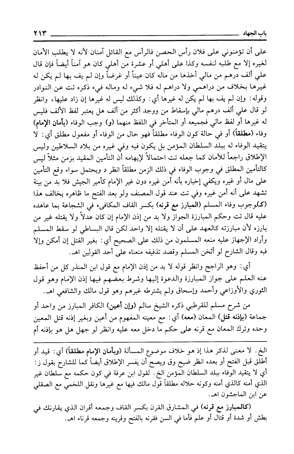 على أن تؤمنوني على فلان رأس الحصين فالرأس مع القائل آمنان لأنه لا يطلب الأمان لغيره إلا مع طلبه لنفسه وكذا على أهلي أو عشرة من أهلي كان هو آمنًا أيضًا فإن قال علي ألف درهم من مالي أخذها من ماله كان عينًا أو غرضًا وإن لم يف بها لم يكن له غيرها بخلاف من دراهمي ولا دراهم له فلا شيء له وماله فيء ذكره تت عن النوادر وقوله: وإن لم يف بها لم يكن له غيرها أي: وكذلك ليس له غيرها إن زاد عليها، وانظر لو قال علي ألف درهم مالي بإسقاط من ووجد أكثر من ألف هل يعتبر لفظ الألف فليس له غيرها أو لفظ مالي فجميعه أو المتأخر في اللفظ منهما (و) وجب الوفاء (بأمان الإِمام) وفاء (مطلقًا) أو في حالة كون الوفاء مطلقًا فهو حال من الوفاء أو مفعول مطلق أي: لا يتقيد الوفاء له ببلد السلطان المؤمن بل يكون فيه وفي غيره من بلاد السلاطين وليس الإطلاق راجعًا للأمان كما جعله تت احتمالًا لإيهامه أن التأمين المقيد بزمن مثلًا ليس كالتأمين المطلق في وجوب الوفاء في ذلك الزمن مطلقًا انظر د ويحتمل سواء وقع التأمين على مال أو غيره ويكفي إخباره بأنه أمن غيره دون غير الإِمام كأمير الجيش فلا بد من بينة تشهد على أنه أمن غيره وفي تت عند قول المصنف ولو بعد الفتح ما ظاهره يخالف هذا (كـ) ـوجوب وفاء المسلم (المبارز مع قرنه) بكسر القاف المكافىء في الشجاعة بما عاهده عليه قال تت وحكم المبارزة الجواز ولا بد من إذن الإِمام إن كان عدلًا ولا يقتله غير من بارزه لأن مبارزته كالعهد على أن لا يقتله إلا واحد لكن قال البساطي لو سقط المسلم وأراد الإجهاز عليه منعه المسلمون من ذلك على الصحيح أي: بغير القتل إن أمكن وإلا فيه وقال الشارح لو أثخن المسلم وقصد تذفيفه منعناه على أحد القولين اهـ.