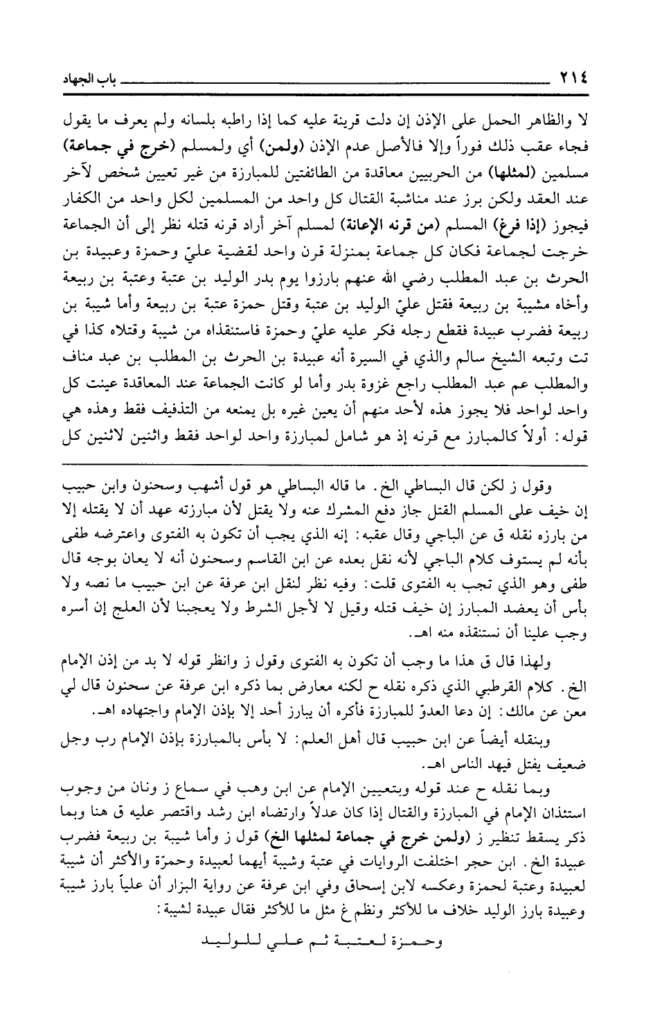 وبما نقله ح عند قوله وبتعيين الإِمام عن ابن وهب في سماع ز ونان من وجوب استئذان الإِمام في المبارزة والقتال إذا كان عدلًا وارتضاه ابن رشد واقتصر عليه ق هنا وبما ذكر يسقط تنظير ز (ولمن خرج في جماعة لمثلها الخ) قول ز وأما شيبة بن ربيعة فضرب عبيدة الخ. ابن حجر اختلفت الروايات في عتبة وشيبة أيهما لعبيدة وحمزة والأكثر أن شيبة لعبيدة وعتبة لحمزة وعكسه لابن إسحاق وفي ابن عرفة عن رواية البزار أن عليًّا بارز شيبة وعبيدة بارز الوليد خلاف ما للأكثر ونظم غ مثل ما للأكثر فقال عبيدة لشيبة: