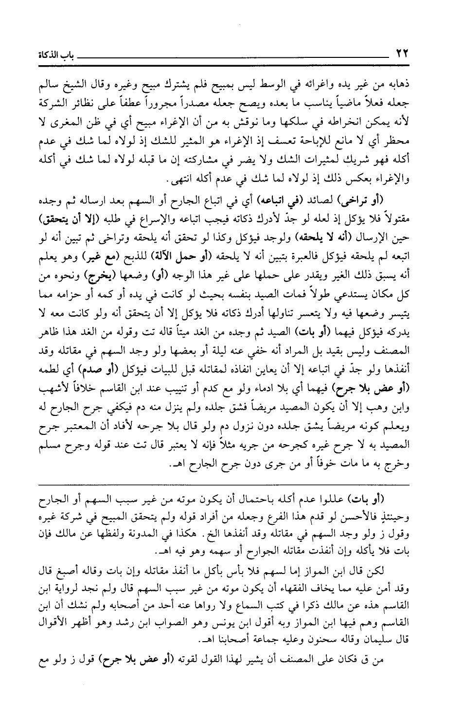 (أو بات) عللوا عدم أكله باحتمال أن يكون موته من غير سبب السهم أو الجارح وحينئذٍ فالأحسن لو قدم هذا الفرع وجعله من أفراد قوله ولم يتحقق المبيح في شركة غيره وقول ز ولو وجد السهم في مقاتله وقد أنفذها الخ. هكذا في المدونة ولفظها عن مالك فإن بات فلا يأكله وإن أنفذت مقاتله الجوارح أو سهمه وهو فيه اهـ.