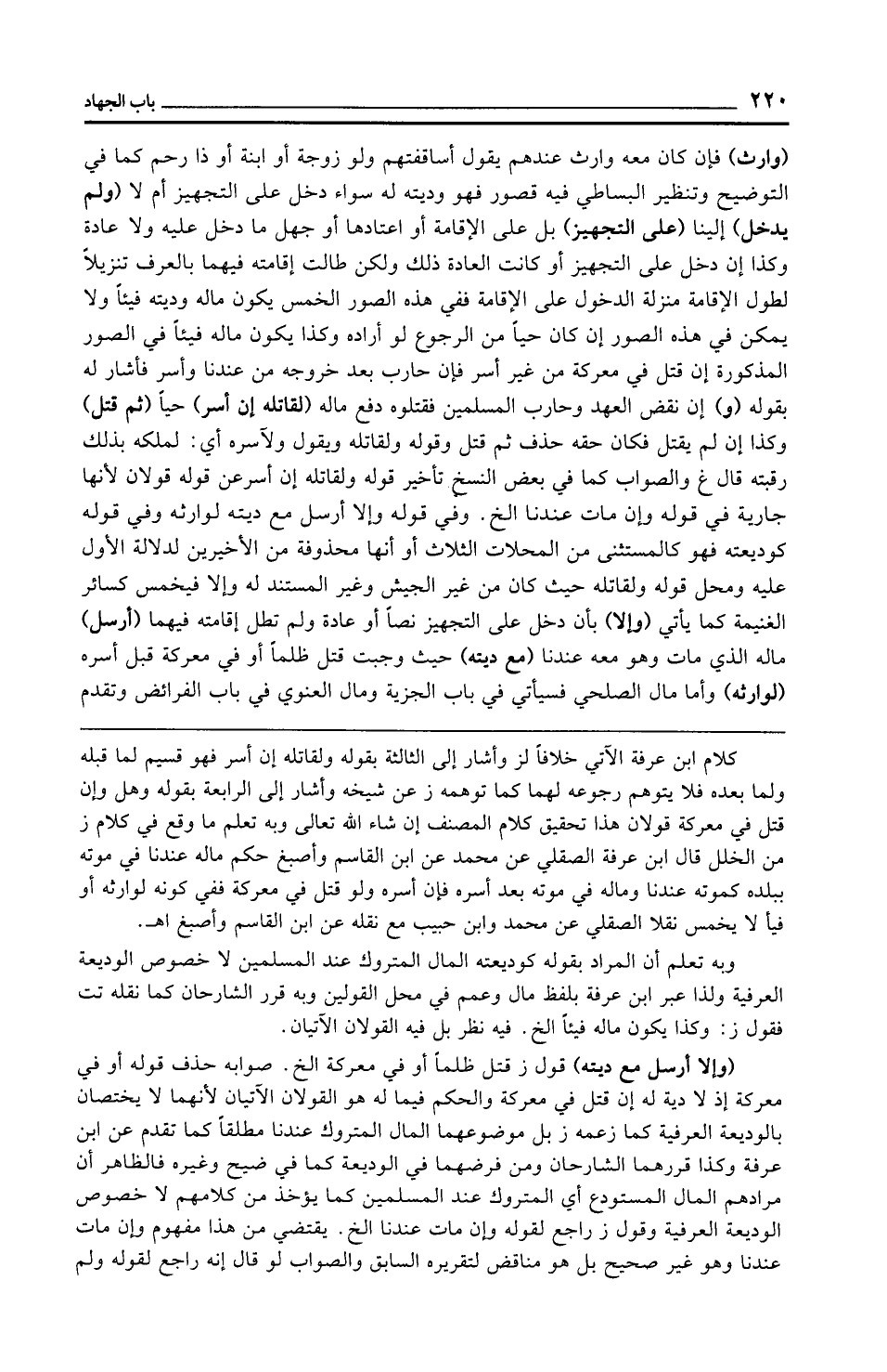 كلام ابن عرفة الآتي خلافًا لز وأشار إلى الثالثة بقوله ولقاتله إن أسر فهو قسيم لما قبله ولما بعده فلا يتوهم رجوعه لهما كما توهمه ز عن شيخه وأشار إلى الرابعة بقوله وهل وإن قتل في معركة قولان هذا تحقيق كلام المصنف إن شاء الله تعالى وبه تعلم ما وقع في كلام ز من الخلل قال ابن عرفة الصقلي عن محمَّد عن ابن القاسم وأصبغ حكم ماله عندنا في موته ببلده كموته عندنا وماله في موته بعد أسره فإن أسره ولو قتل في معركة ففي كونه لوارثه أو فيأ لا يخمس نقلا الصقلي عن محمَّد وابن حبيب مع نقله عن ابن القاسم وأصبغ اهـ.