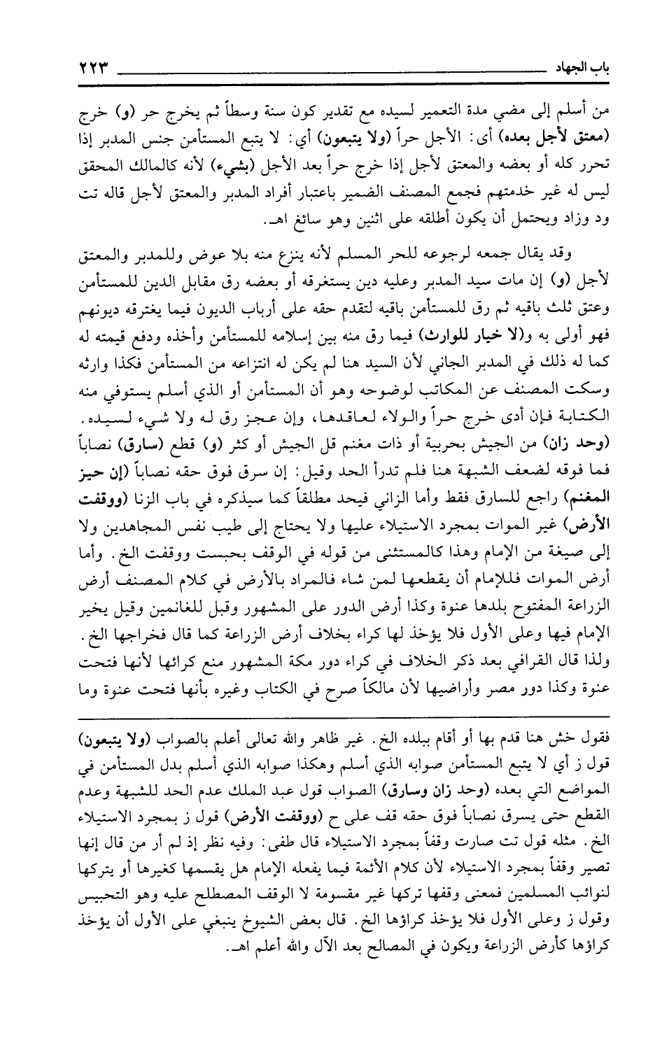 فقول خش هنا قدم بها أو أقام ببلده الخ. غير ظاهر والله تعالى أعلم بالصواب (ولا يتبعون) قول ز أي لا يتبع المستأمن صوابه الذي أسلم وهكذا صوابه الذي أسلم بدل المستأمن في المواضع التي بعده (وحد زان وسارق) الصواب قول عبد الملك عدم الحد للشبهة وعدم القطع حتى يسرق نصابًا فوق حقه قف على ح (ووقفت الأرض) قول ز بمجرد الاستيلاء الخ. مثله قول تت صارت وقفًا بمجرد الاستيلاء قال طفى: وفيه نظر إذ لم أر من قال إنها تفسير وقفًا بمجرد الاستيلاء لأن كلام الأئمة فيما يفعله الإِمام هل يقسمها كغيرها أو يتركها لنوائب المسلمين فمعنى وقفها تركها غير مقسومة لا الوقف المصطلح عليه وهو التحبيس وقول ز وعلى الأول فلا يؤخذ كراؤها الخ. قال بعض الشيوخ ينبغي على الأول أن يؤخذ كراؤها كأرض الزراعة ويكون في المصالح بعد الآل والله أعلم اهـ.