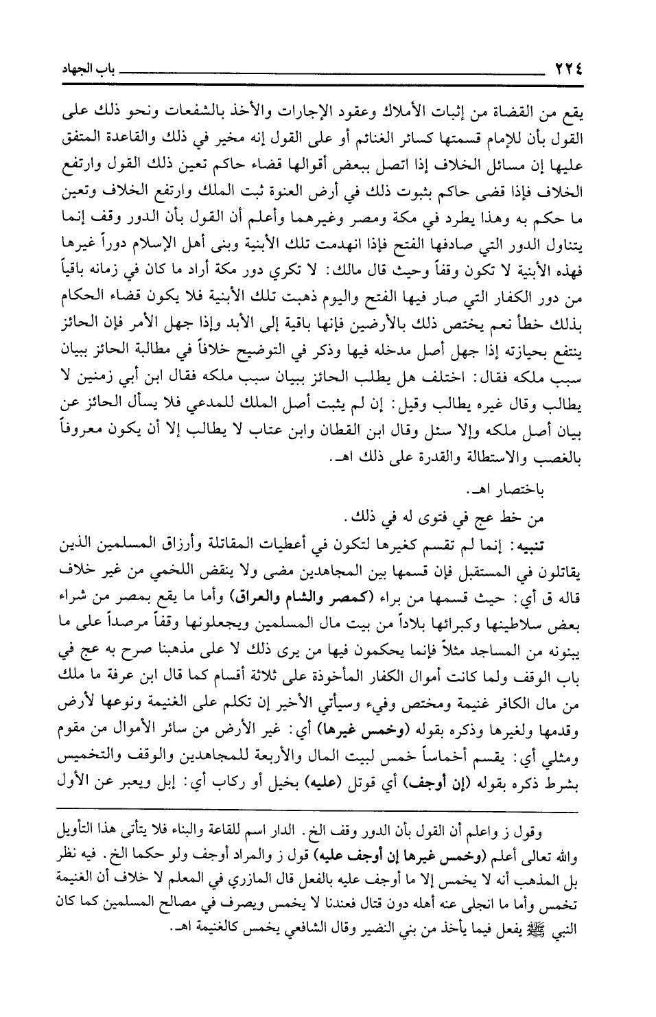 تنبيه: إنما لم تقسم كغيرها لتكون في أعطيات المقاتلة وأرزاق المسلمين الذين يقاتلون في المستقبل فإن قسمها بين المجاهدين مضى ولا ينقض اللخمي من غير خلاف قاله ق أي: حيث قسمها من براء (كمصر والشام والعراق) وأما ما يقع بمصر من شراء بعض سلاطينها وكبرائها بلادًا من بيت مال المسلمين ويجعلونها وقفًا مرصدًا على ما يبنونه من المساجد مثلًا فإنما يحكمون فيها من يرى ذلك لا على مذهبنا صرح به عج في باب الوقف ولما كانت أموال الكفار المأخوذة على ثلاثة أقسام كما قال ابن عرفة ما ملك من مال الكافر غنيمة ومختص وفيء وسيأتي الأخير إن تكلم على الغنيمة ونوعها لأرض وقدمها ولغيرها وذكره بقوله (وخمس غيرها) أي: غير الأرض من سائر الأموال من مقوم ومثلي أي: يقسم أخماسًا خمس لبيت المال والأربعة للمجاهدين والوقف والتخميس بشرط ذكره بقوله (إن أوجف) أي قوتل (عليه) بخيل أو ركاب أي: إبل ويعبر عن الأول