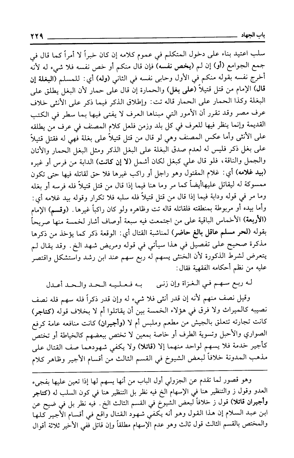 وهو قصور لما تقدم عن الجزولي أول الباب من أنها يسهم لها إذا تعين عليها بفجىء العدو وقول ز والتنظير هنا في الإسهام الخ فيه نظر بل التنظير هنا في كون السلب له (كتاجر وأجيران قاتلا) قول ز خلافًا لبعض الشيوخ في القسم الثالث الخ. فيه نظر بل في ضيح عن ابن عبد السلام إن هذا القول وهو أنه يكفي شهود القتال واقع في أقسام الأجير كلها والمختص بالقسم الثالث قول ثالث وهو عدم الإسهام مطلقًا وإن قاتل ففي الأخير ثلاثة أقوال