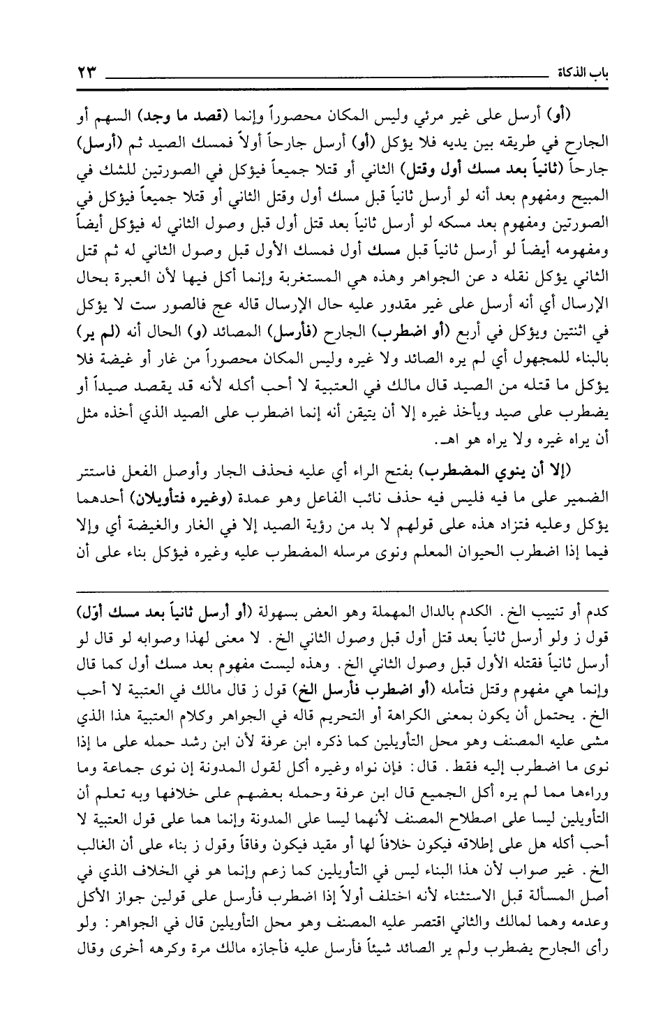 (إلا أن ينوي المضطرب) بفتح الراء أي عليه فحذف الجار وأوصل الفعل فاستتر الضمير على ما فيه فليس فيه حذف نائب الفاعل وهو عمدة (وغيره فتأويلان) أحدهما يؤكل وعليه فتزاد هذه على قولهم لا بد من رؤية الصيد إلا في الغار والغيضة أي وإلا فيما إذا اضطرب الحيوان المعلم ونوى مرسله المضطرب عليه وغيره فيؤكل بناء على أن