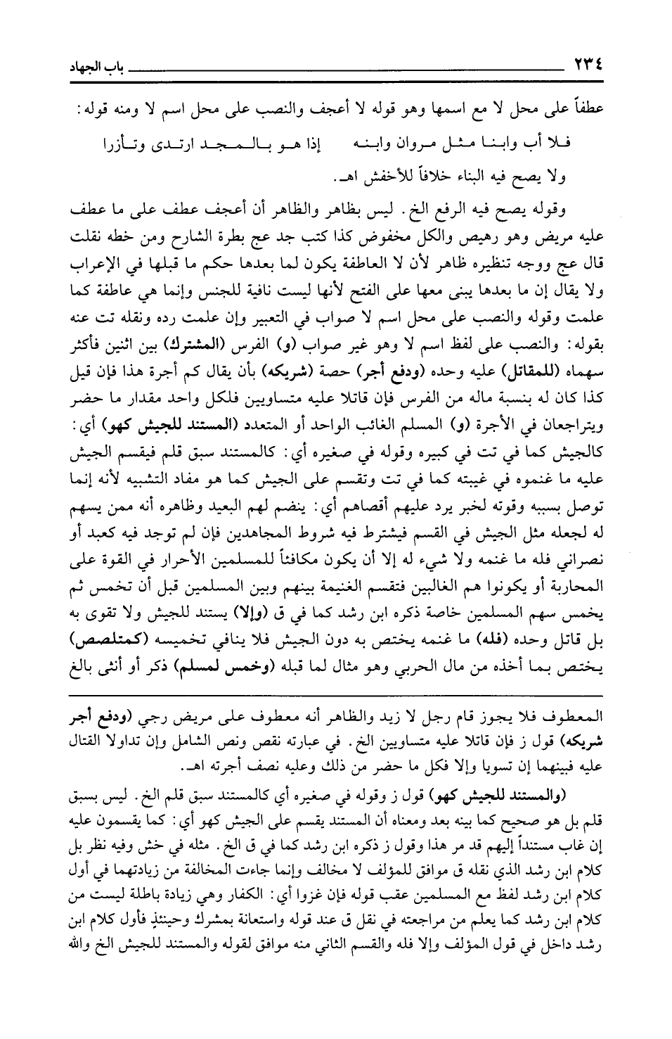 وقوله يصح فيه الرفع الخ. ليس بظاهر والظاهر أن أعجف عطف على ما عطف عليه مريض وهو رهيص والكل مخفوض كذا كتب جد عج بطرة الشارح ومن خطه نقلت قال عج ووجه تنظيره ظاهر لأن لا العاطفة يكون لما بعدها حكم ما قبلها في الإعراب ولا يقال إن ما بعدها يبنى معها على الفتح لأنها ليست نافية للجنس وإنما هي عاطفة كما علمت وقوله والنصب على محل اسم لا صواب في التعبير وإن علمت رده ونقله تت عنه بقوله: والنصب على لفظ اسم لا وهو غير صواب (و) الفرس (المشترك) بين اثنين فأكثر سهماه (للمقاتل) عليه وحده (ودفع أجر) حصة (شريكه) بأن يقال كم أجرة هذا فإن قيل كذا كان له بنسبة ماله من الفرس فإن قاتلا عليه متساويين فلكل واحد مقدار ما حضر ويتراجعان في الأجرة (و) المسلم الغائب الواحد أو المتعدد (المستند للجيش كهو) أي: كالجيش كما في تت في كبيره وقوله في صغيره أي: كالمستند سبق قلم فيقسم الجيش عليه ما غنموه في غيبته كما في تت وتقسم على الجيش كما هو مفاد التشبيه لأنه إنما توصل بسببه وقوته لخبر يرد عليهم أقصاهم أي: ينضم لهم البعيد وظاهره أنه ممن يسهم له لجعله مثل الجيش في القسم فيشترط فيه شروط المجاهدين فإن لم توجد فيه كعبد أو نصراني فله ما غنمه ولا شيء له إلا أن يكون مكافئًا للمسلمين الأحرار في القوة على المحاربة أو يكونوا هم الغالبين فتقسم الغنيمة بينهم وبين المسلمين قبل أن تخمس ثم يخمس سهم المسلمين خاصة ذكره ابن رشد كما في ق (وإلا) يستند للجيش ولا تقوى به بل قاتل وحده (فله) ما غنمه يختص به دون الجيش فلا ينافي تخميسه (كمتلصص) يختص بما أخذه من مال الحربي وهو مثال لما قبله (وخمس لمسلم) ذكر أو أنثى بالغ