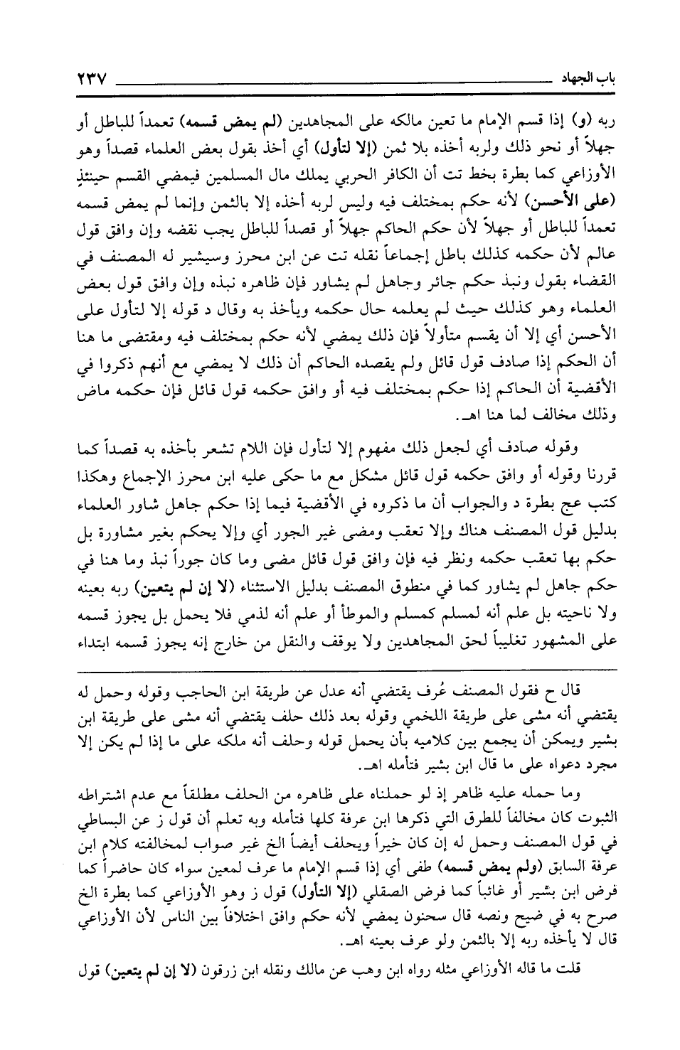 ربه (و) إذا قسم الإِمام ما تعين مالكه على المجاهدين (لم يمض قسمه) تعمدًا للباطل أو جهلًا أو نحو ذلك ولربه أخذه بلا ثمن (إلا لتأول) أي أخذ يقول بعض العلماء قصدًا وهو الأوزاعي كما بطرة بخط تت أن الكافر الحربي يملك مال المسلمين فيمضي القسم حينئذٍ (على الأحسن) لأنه حكم بمختلف فيه وليس لربه أخذه إلا بالثمن وإنما لم يمض قسمه تعمدًا للباطل أو جهلًا لأن حكم الحاكم جهلًا أو قصدًا للباطل يجب نقضه وإن وافق قول عالم لأن حكمه كذلك باطل إجماعًا نقله تت عن ابن محرز وسيشير له المصنف في القضاء يقول ونبذ حكم جائر وجاهل لم يشاور فإن ظاهره نبذه وإن وافق قول بعض العلماء وهو كذلك حيث لم يعلمه حال حكمه ويأخذ به وقال د قوله إلا لتأول على الأحسن أي إلا أن يقسم متاولًا فإن ذلك يمضي لأنه حكم بمختلف فيه ومقتضى ما هنا أن الحكم إذا صادف قول قائل ولم يقصده الحاكم أن ذلك لا يمضي مع أنهم ذكروا في الأقضية أن الحاكم إذا حكم بمختلف فيه أو وافق حكمه قول قائل فإن حكمه ماض وذلك مخالف لما هنا اهـ.