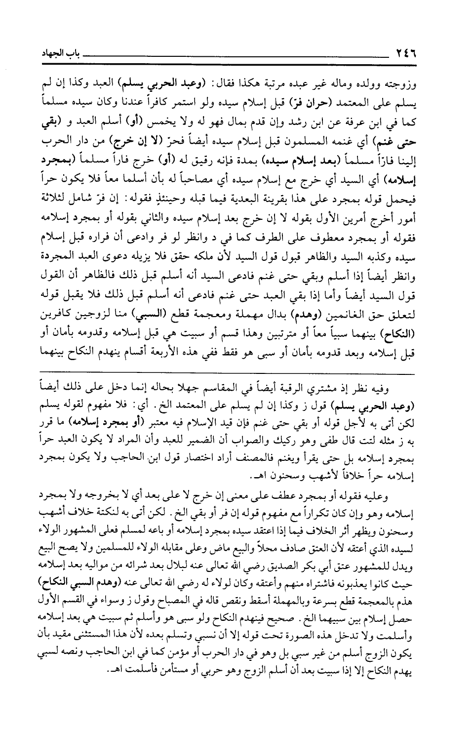 وفيه نظر إذ مشتري الرقبة أيضًا في المقاسم جهلًا بحاله إنما دخل على ذلك أيضًا (وعبد الحربي يسلم) قول ز وكذا إن لم يسلم على المعتمد الخ. أي: فلا مفهوم لقوله يسلم لكن أتى به لأجل قوله أو بقي حتى غنم فإن قيد الإِسلام فيه معتبر (أو بمجرد إسلامه) ما قرر به ز مثله لتت قال طفى وهو ركيك والصواب أن الضمير للعبد وأن المراد لا يكون العبد حرًّا بمجرد إسلامه بل حتى يقرأ ويغنم فالمصنف أراد اختصار قول ابن الحاجب ولا يكون بمجرد إسلامه حرًّا خلافًا لأشهب وسحنون اهـ.