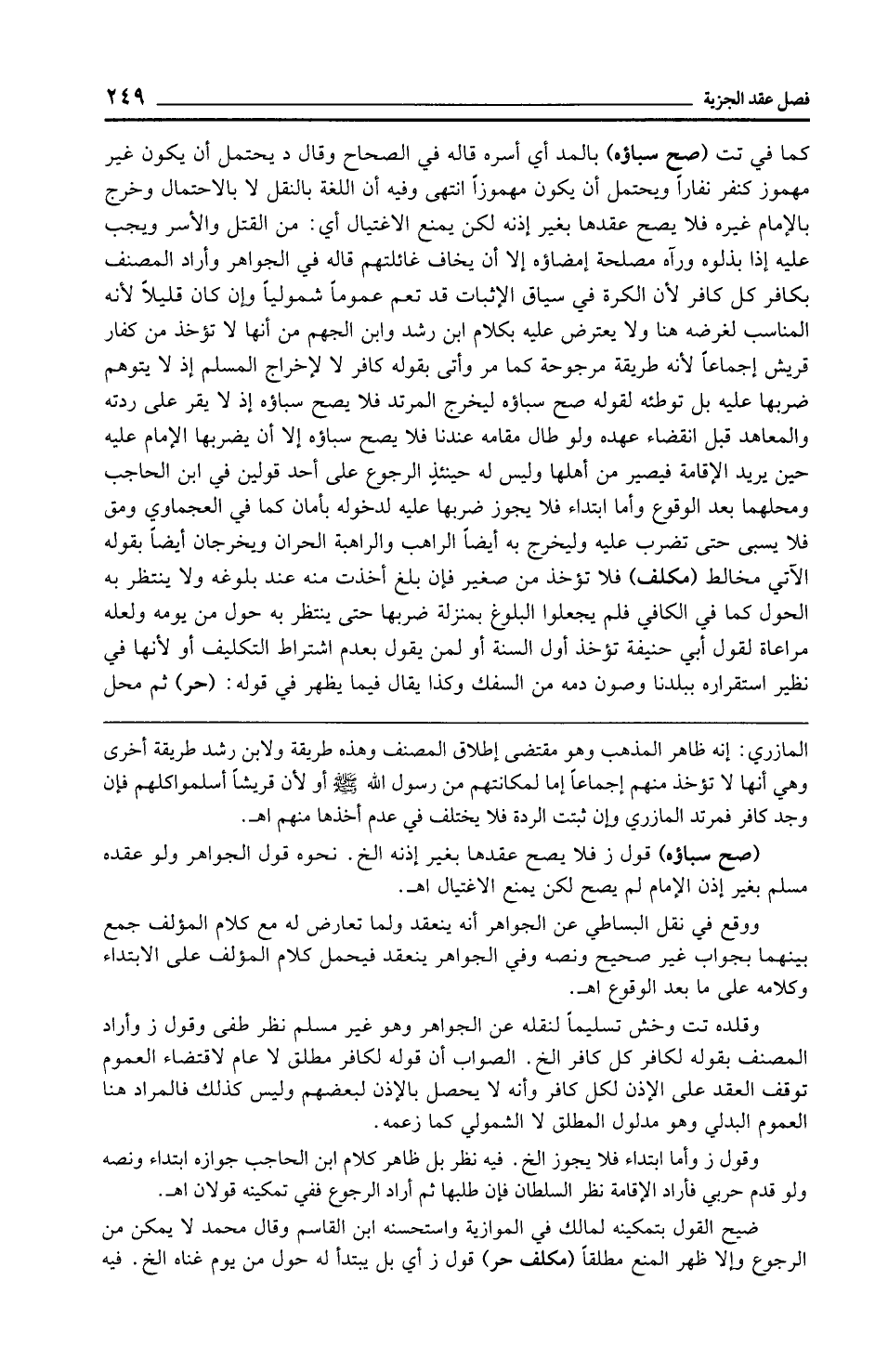 كما في تت (صح سباؤه) بالمد أي أسره قاله في الصحاح وقال د يحتمل أن يكون غير مهموز كنفر نفارًا ويحتمل أن يكون مهموزًا انتهى وفيه أن اللغة بالنقل لا بالاحتمال وخرج بالإمام غيره فلا يصح عقدها بغير إذنه لكن يمنع الاغتيال أي: من القتل والأسر ويجب عليه إذا بذلوه ورآه مصلحة إمضاؤه إلا أن يخاف غائلتهم قاله في الجواهر وأراد المصنف بكافر كل كافر لأن الكرة في سياق الإثبات قد تعم عمومًا شموليًّا وإن كان قليلًا لأنه المناسب لغرضه هنا ولا يعترض عليه بكلام ابن رشد وابن الجهم من أنها لا تؤخذ من كفار قريش إجماعًا لأنه طريقة مرجوحة كما مر وأتى بقوله كافر لا لإخراج المسلم إذ لا يتوهم ضربها عليه بل توطئه لقوله صح سباؤه ليخرج المرتد فلا يصح سباؤه إذ لا يقر على ردته والمعاهد قبل انقضاء عهده ولو طال مقامه عندنا فلا يصح سباؤه إلا أن يضربها الإِمام عليه حين يريد الإقامة فيصير من أهلها وليس له حينئذٍ الرجوع على أحد قولين في ابن الحاجب ومحلهما بعد الوقوع وأما ابتداء فلا يجوز ضربها عليه لدخوله بأمان كما في العجماوي ومن فلا يسبى حتى تضرب عليه وليخرج به أيضًا الراهب والراهبة الحران ويخرجان أيضًا بقوله الآتي مخالط (مكلف) فلا تؤخذ من صغير فإن بلغ أخذت منه عند بلوغه ولا ينتظر به الحول كما في الكافي فلم يجعلوا البلوغ بمنزلة ضربها حتى ينتظر به حول من يومه ولعله مراعاة لقول أبي حنيفة تؤخذ أول السنة أو لمن يقول بعدم اشتراط التكليف أو لأنها في نظير استقراره ببلدنا وصون دمه من السفك وكذا يقال فيما يظهر في قوله: (حر) ثم محل