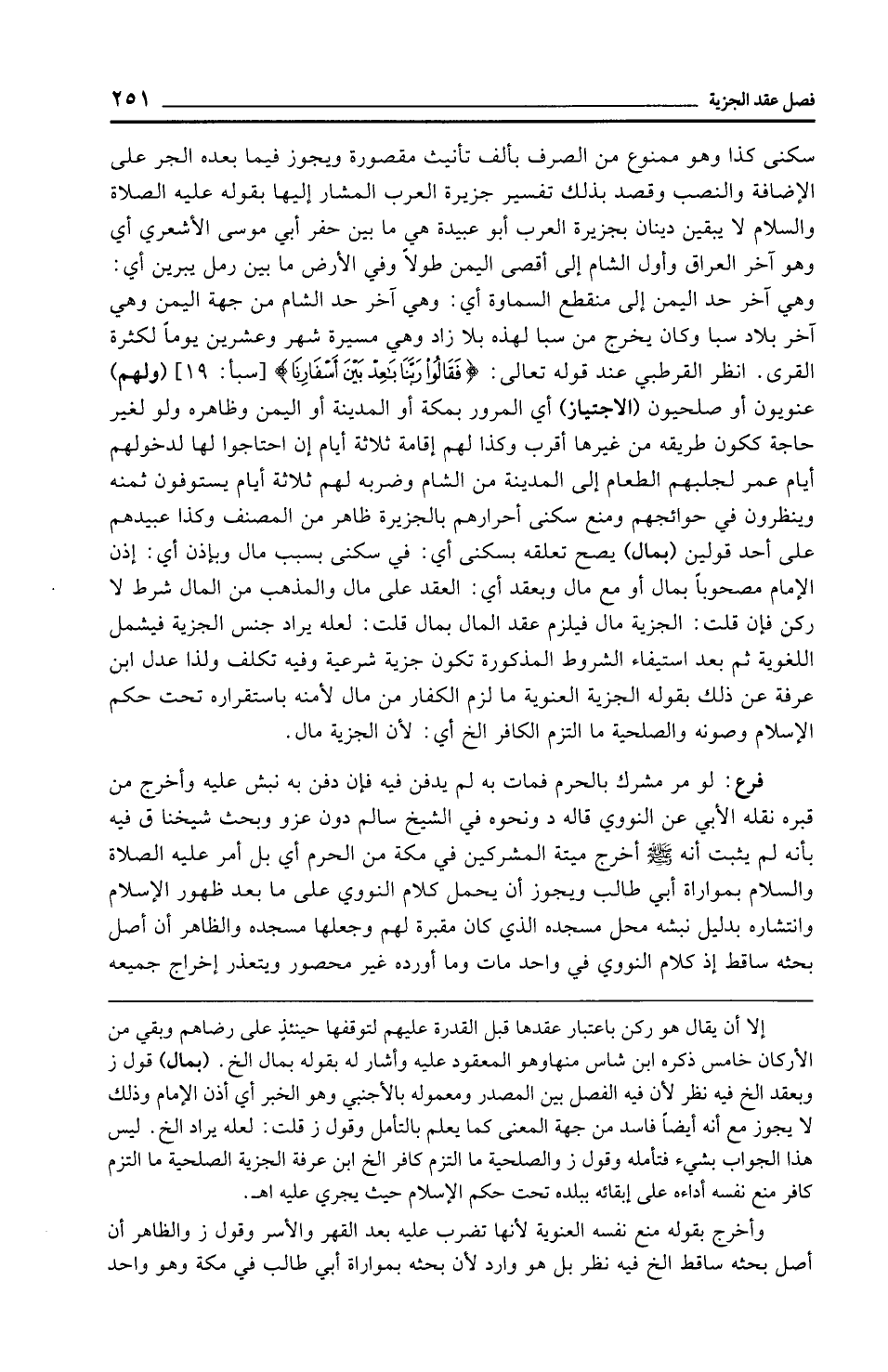 سكنى كذا وهو ممنوع من الصرف بألف تأنيث مقصورة ويجوز فيما بعده الجر على الإضافة والنصب وقصد بذلك تفسير جزيرة العرب المشار إليها بقوله عليه الصلاة والسلام لا يبقين دينان بجزيرة العرب أبو عبيدة هي ما بين حفر أبي موسى الأشعري أي وهو آخر العراق وأول الشام إلى أقصى اليمن طولًا وفي الأرض ما بين رمل يبرين أي: وهي آخر حد اليمن إلى منقطع السماوة أي: وهي آخر حد الشام من جهة اليمن وهي آخر بلاد سبا وكان يخرج من سبا لهذه بلا زاد وهي مسيرة شهر وعشرين يومًا لكثرة القرى. انظر القرطبي عند قوله تعالى: {فَقَالُوا رَبَّنَا بَاعِدْ بَيْنَ أَسْفَارِنَا} [سبأ: 19] (ولهم) عنويون أو صلحيون (الاجتياز) أي المرور بمكة أو المدينة أو اليمن وظاهره ولو لغير حاجة يكون طريقه من غيرها أقرب وكذا لهم إقامة ثلاثة أيام إن احتاجوا لها لدخولهم أيام عمر لجلبهم الطعام إلى المدينة من الشام وضربه لهم ثلاثة أيام يستوفون ثمنه وينظرون في حوائجهم ومنع سكنى أحرارهم بالجزيرة ظاهر من المصنف وكذا عبيدهم على أحد قولين (بمال) يصح تعلقه بسكنى أي: في سكنى بسبب مال وبإذن أي: إذن الإِمام مصحوبًا بمال أو مع مال وبعقد أي: العقد على مال والمذهب من المال شرط لا ركن فإن قلت: الجزية مال فيلزم عقد المال بمال قلت: لعله يراد جنس الجزية فيشمل اللغوية ثم بعد استيفاء الشروط المذكورة تكون جزية شرعية وفيه تكلف ولذا عدل ابن عرفة عن ذلك بقوله الجزية المعنوية ما لزم الكفار من مال لأمنه باستقراره تحت حكم الإِسلام وصونه والصلحية ما التزم الكافر الخ أي: لأن الجزية مال.