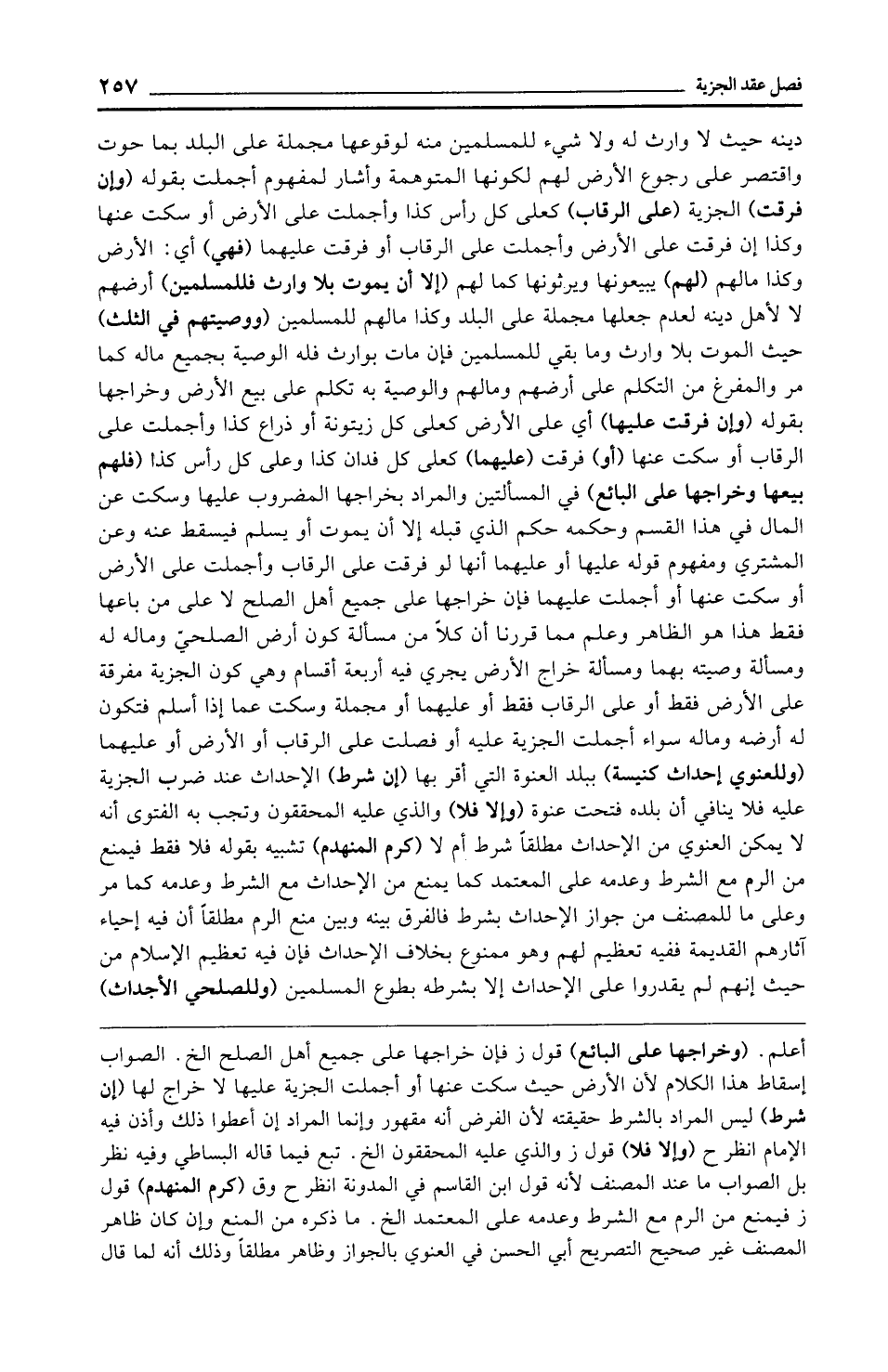 دينه حيث لا وارث له ولا شيء للمسلمين منه لوقوعها مجملة على البلد بما حوت واقتصر على رجوع الأرض لهم لكونها المتوهمة وأشار لمفهوم أجملت بقوله (وإن فرقت) الجزية (على الرقاب) كعلى كل رأس كذا وأجملت على الأرض أو سكت عنها وكذا إن فرقت على الأرض وأجملت على الرقاب أو فرقت عليهما (فهي) أي: الأرض وكذا مالهم (لهم) يبيعونها ويرثونها كما لهم (إلا أن يموت بلا وارث فللمسلمين) أرضهم لا لأهل دينه لعدم جعلها مجملة على البلد وكذا مالهم للمسلمين (ووصيتهم في الثلث) حيث الموت بلا وارث وما بقي للمسلمين فإن مات بوارث فله الوصية بجميع ماله كما مر والمفرغ من التكلم على أرضهم ومالهم والوصية به تكلم على بيع الأرض وخراجها بقوله (وإن فرقت عليها) أي على الأرض كعلى كل زيتونة أو ذراع كذا وأجملت على الرقاب أو سكت عنها (أو) فرقت (عليهما) كعلى كل فدان كذا وعلى كل رأس كذا (فلهم بيعها وخراجها على البائع) في المسألتين والمراد بخراجها المضروب عليها وسكت عن المال في هذا القسم وحكمه حكم الذي قبله إلا أن يموت أو يسلم فيسقط عنه وعن المشتري ومفهوم قوله عليها أو عليهما أنها لو فرقت على الرقاب وأجملت على الأرض أو سكت عنها أو أجملت عليهما فإن خراجها على جميع أهل الصلح لا على من باعها فقط هذا هو الظاهر وعلم مما قررنا أن كلا من مسألة كون أرض الصلحيّ وماله له ومسألة وصيته بهما ومسألة خراج الأرض يجري فيه أربعة أقسام وهي كون الجزية مفرقة على الأرض فقط أو على الرقاب فقط أو عليهما أو مجملة وسكت عما إذا أسلم فتكون له أرضه وماله سواء أجملت الجزية عليه أو فصلت على الرقاب أو الأرض أو عليهما (وللعنوي إحداث كنيسة) ببلد العنوة التي أقر بها (إن شرط) الإحداث عند ضرب الجزية عليه فلا ينافي أن بلده فتحت عنوة (وإلا فلا) والذي عليه المحققون وتجب به الفتوى أنه لا يمكن العنوي من الإحداث مطلقًا شرط أم لا (كرم المنهدم) تشبيه بقوله فلا فقط فيمنع من الرم مع الشرط وعدمه على المعتمد كما يمنع من الإحداث مع الشرط وعدمه كما مر وعلى ما للمصنف من جواز الإحداث بشرط فالفرق بينه وبين منع الرم مطلقًا أن فيه إحياء آثارهم القديمة ففيه تعظيم لهم وهو ممنوع بخلاف الإحداث فإن فيه تعظيم الإِسلام من حيث إنهم لم يقدروا على الإحداث إلا بشرطه بطوع المسلمين (وللصلحي الأجداث)