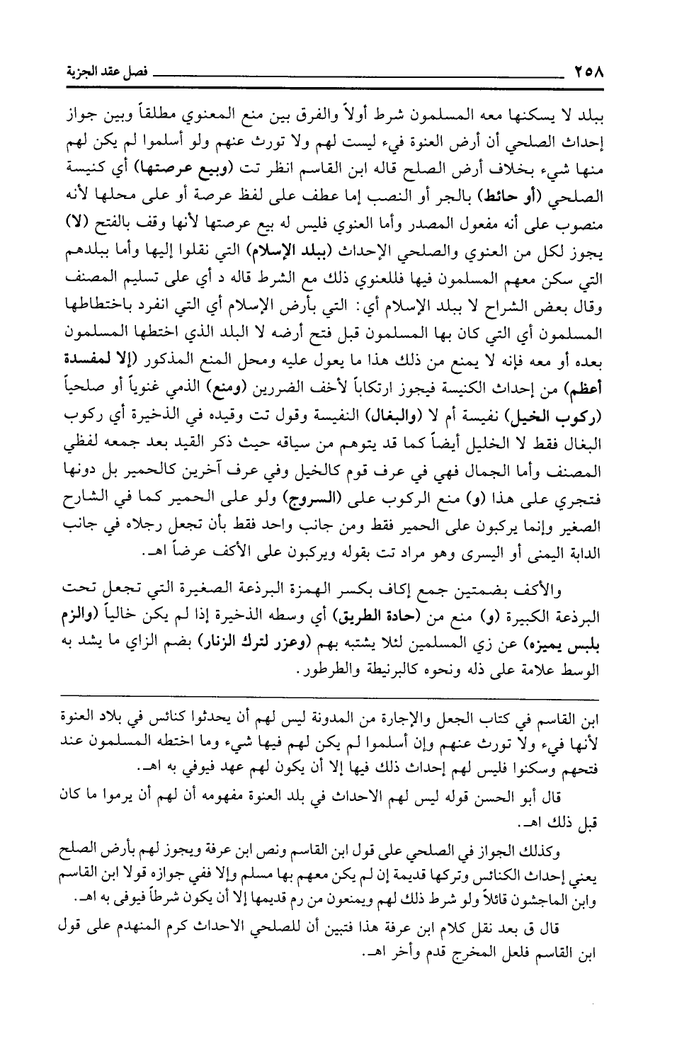 ببلد لا يسكنها معه المسلمون شرط أولًا والفرق بين منع المعنوي مطلقًا وبين جواز إحداث الصلحي أن أرض العنوة فيء ليست لهم ولا تورث عنهم ولو أسلموا لم يكن لهم منها شيء بخلاف أرض الصلح قاله ابن القاسم انظر تت (وبيع عرصتها) أي كنيسة الصلحي (أو حائط) بالجر أو النصب إما عطف على لفظ عرصة أو على محلها لأنه منصوب على أنه مفعول المصدر وأما العنوي فليس له بيع عرصتها لأنها وقف بالفتح (لا) يجوز لكل من العنوي والصلحي الإحداث (ببلد الإِسلام) التي نقلوا إليها وأما ببلدهم التي سكن معهم المسلمون فيها فللعنوي ذلك مع الشرط قاله د أي على تسليم المصنف وقال بعض الشراح لا ببلد الإِسلام أي: التي بأرض الإِسلام أي التي انفرد باختطاطها المسلمون أي التي كان بها المسلمون قبل فتح أرضه لا البلد الذي اختطها المسلمون بعده أو معه فإنه لا يمنع من ذلك هذا ما يعول عليه ومحل المنع المذكور (إلا لمفسدة أعظم) من إحداث الكنيسة فيجوز ارتكابًا لأخف الضررين (ومنع) الذمي غنويًّا أو صلحيًّا (ركوب الخيل) نفيسة أم لا (والبغال) النفيسة وقول تت وقيده في الذخيرة أي ركوب البغال فقط لا الخليل أيضًا كما قد يتوهم من سياقه حيث ذكر القيد بعد جمعه لفظي المصنف وأما الجمال فهي في عرف قوم كالخيل وفي عرف آخرين كالحمير بل دونها فتجري على هذا (و) منع الركوب على (السروج) ولو على الحمير كما في الشارح الصغير وإنما يركبون على الحمير فقط ومن جانب واحد فقط بأن تجعل رجلاه في جانب الدابة اليمنى أو اليسرى وهو مراد تت بقوله ويركبون على الأكف عرضًا اهـ.