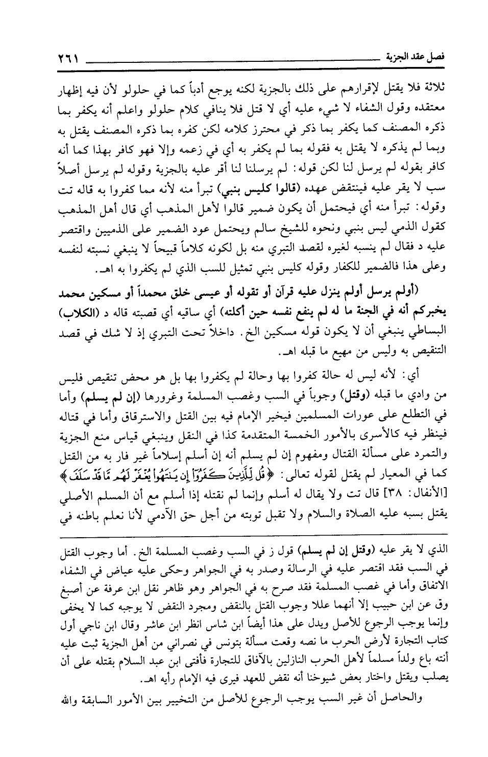 الذي لا يقر عليه (وقتل إن لم يسلم) قول ز في السب وغصب المسلمة الخ. أما وجوب القتل في السب فقد اقتصر عليه في الرسالة وصدر به في الجواهر وحكى عليه عياض في الشفاء الاتفاق وأما في غصب المسلمة فقد صرح به في الجواهر وهو ظاهر نقل ابن عرفة عن أصبغ وق عن ابن حبيب إلا أنهما عللا وجوب القتل بالنقض ومجرد النقض لا يوجبه كما لا يخفى وإنما يوجب الرجوع للأصل ويدل على هذا أيضًا ابن شاس انظر ابن عاشر وقال ابن ناجي أول كتاب التجارة لأرض الحرب ما نصه وقعت مسألة بتونس في نصراني من أهل الجزية ثبت عليه أنه باع ولدًا مسلمًا لأهل الحرب النازلين بالآفاق للتجارة فأفتى ابن عبد السلام بقتله على أن يصلب ويقتل واختار بعض شيوخنا أنه نقض للعهد فيرى فيه الإِمام رأيه اهـ.