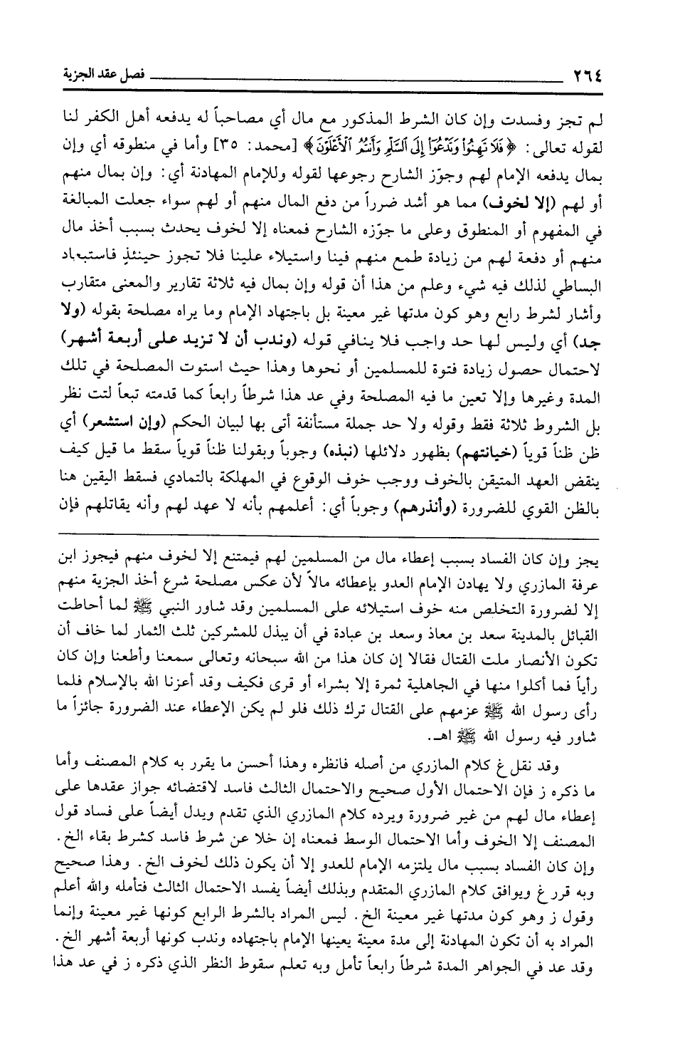 وإن كان الفساد بسبب مال يلتزمه الإِمام للعدو إلا أن يكون ذلك لخوف الخ. وهذا صحيح وبه قرر غ ويوافق كلام المازري المتقدم وبذلك أيضًا يفسد الاحتمال الثالث فتأمله والله أعلم وقول ز وهو كون مدتها غير معينة الخ. ليس المراد بالشرط الرابع كونها غير معينة وإنما المراد به أن تكون المهادنة إلى مدة معينة يعينها الإِمام باجتهاده وندب كونها أربعة أشهر الخ. وقد وعد في الجواهر المدة شرطًا رابعًا تأمل وبه تعلم سقوط النظر الذي ذكره ز في عد هذا