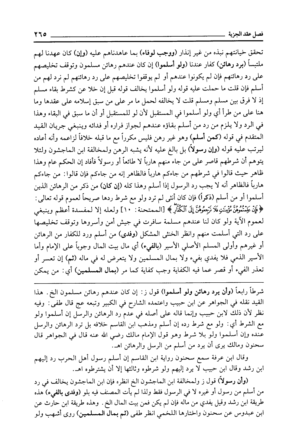 شرطًا رابعًا (وأن يرد رهائن ولو أسلموا) قول ز: إن كان عندهم رهائن مسلمون الخ. هذا القيد نقله في الجواهر عن ابن حبيب واعتمده الشارح في الكبير وتبعه عج قال طفى: وفيه نظر لأن ذلك لابن حبيب وإنما قاله على أصله في عدم رد الرهائن والرسل إن أسلموا ولو مع الشرط أي: ولو مع شرط رده إن أسلم ومذهب ابن القاسم خلافه بل ترد الرهائن والرسل عنده وإن أسلموا ولو بلا شرط وهو قول الإِمام مالك رضي الله عنه قال في الجواهر قال سحنون ومالك يرى أن يرد من أسلم من الرسل والرهائن اهـ.